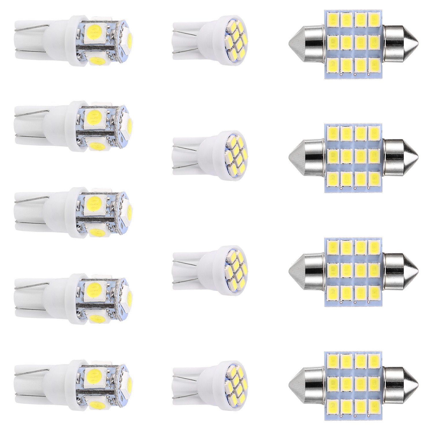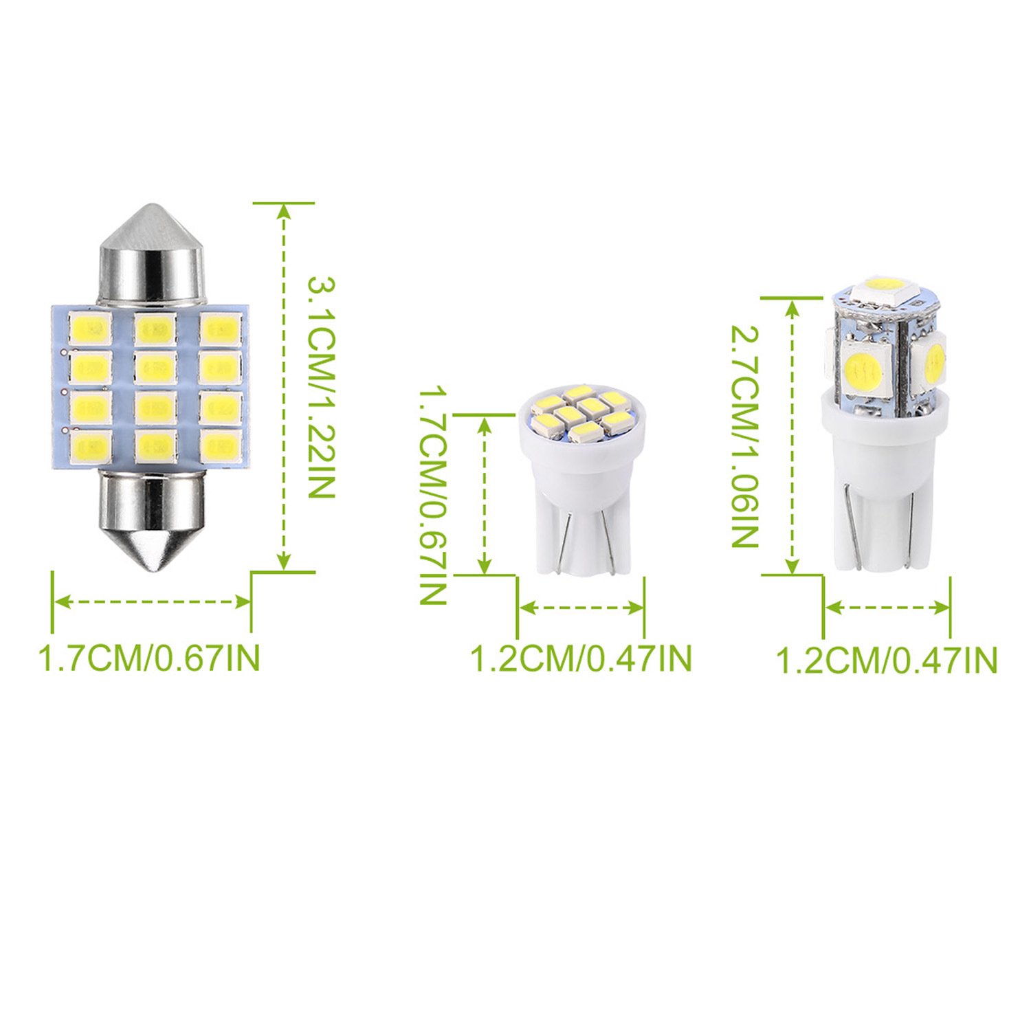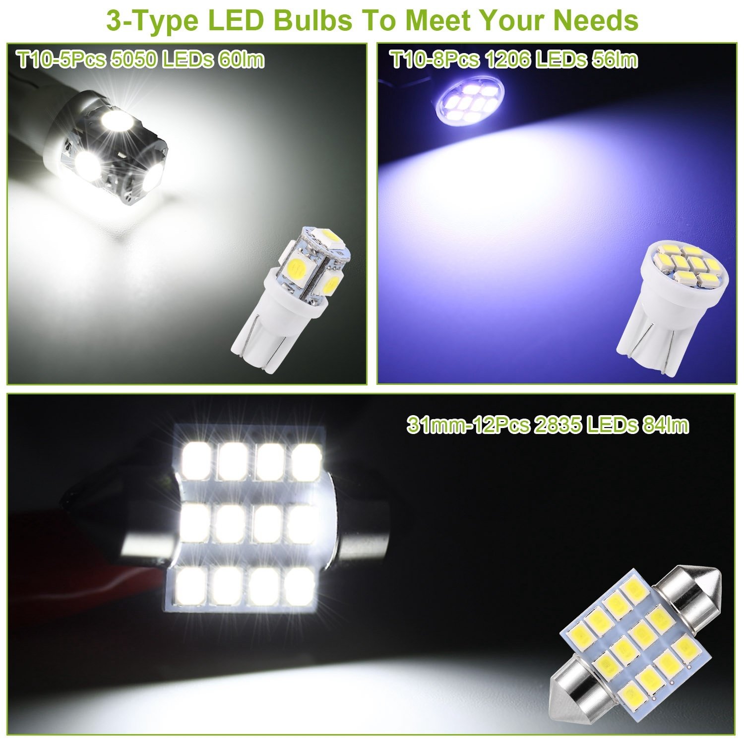 *Economical Festoon LED Interior Light Kit*:Including total 13pcs festoon LED light bulbs(5pcs T10 5050 5LEDs bulbs,4pcs T101206 8LEDs bulbs and 4pcs 31mm 2835 12LEDs bulbs) to snugly replace your original dim light bulbs and make your car interior brand new.