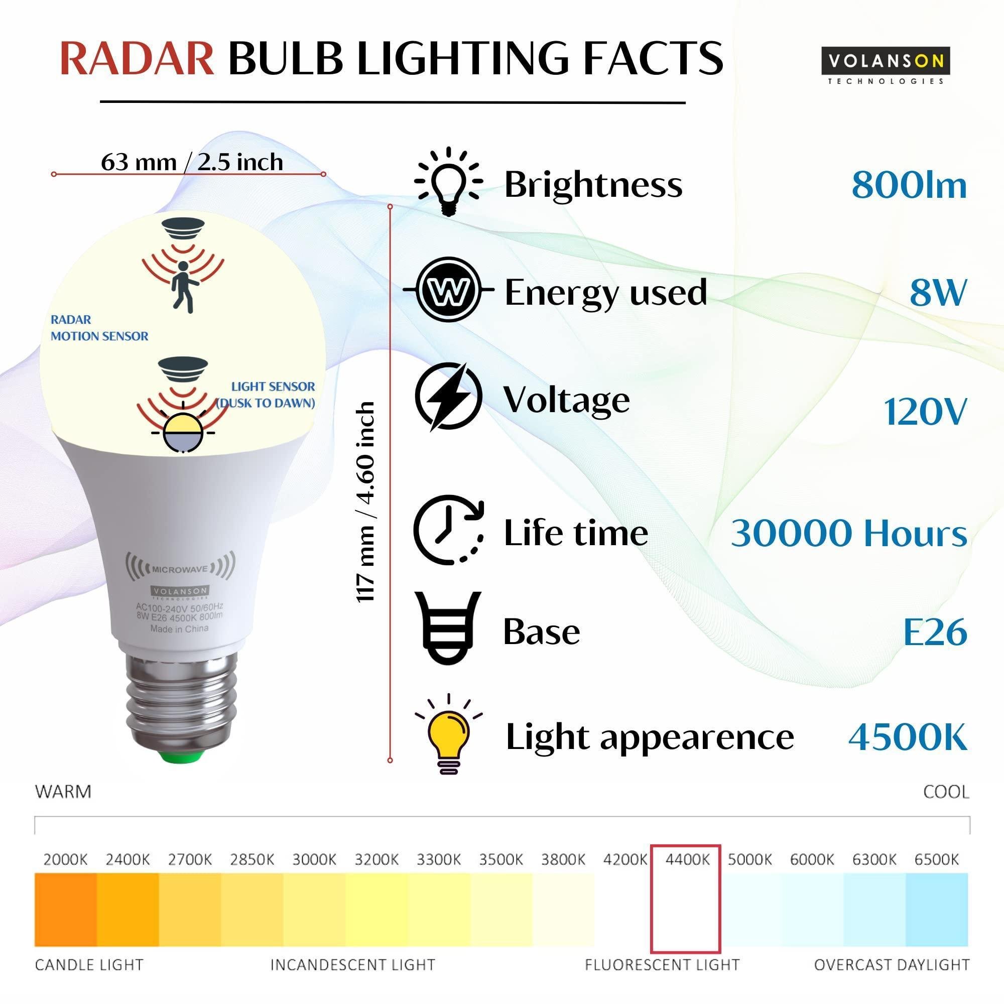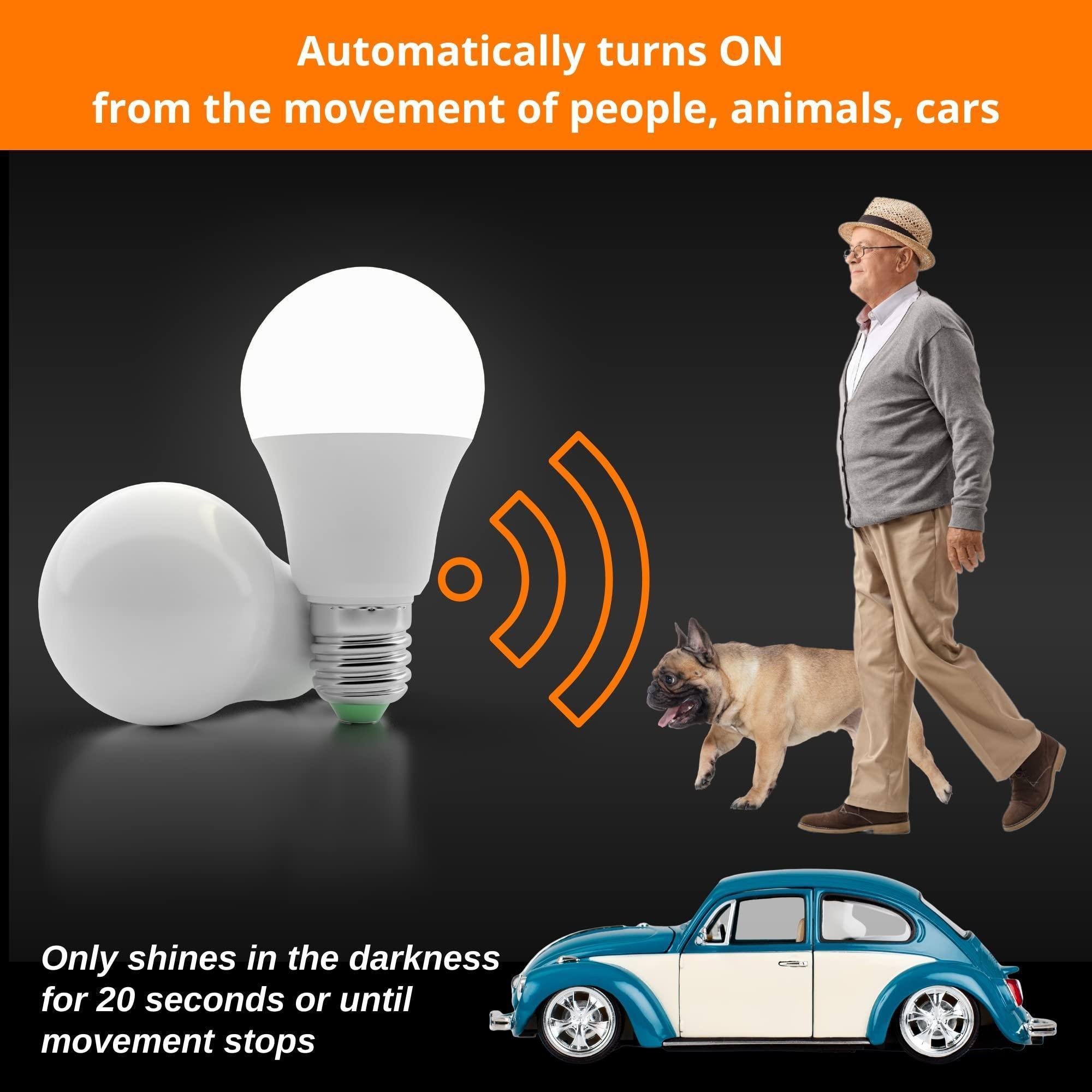 1.radar motion activated light bulbs have two sensors - a light sensor doesn't allow outdoor motion sensor light bulbs to turn on at illumination of more than 30 lux. radar sensor will automatically light up sensor motion light bulbs if it senses movement within 12-20 feet at night or in dark, dusk to dawn, sunset to sunrise. motion sensor bulb will auto turn off after 45 seconds if movement stops. best motion detection distance 16ft.