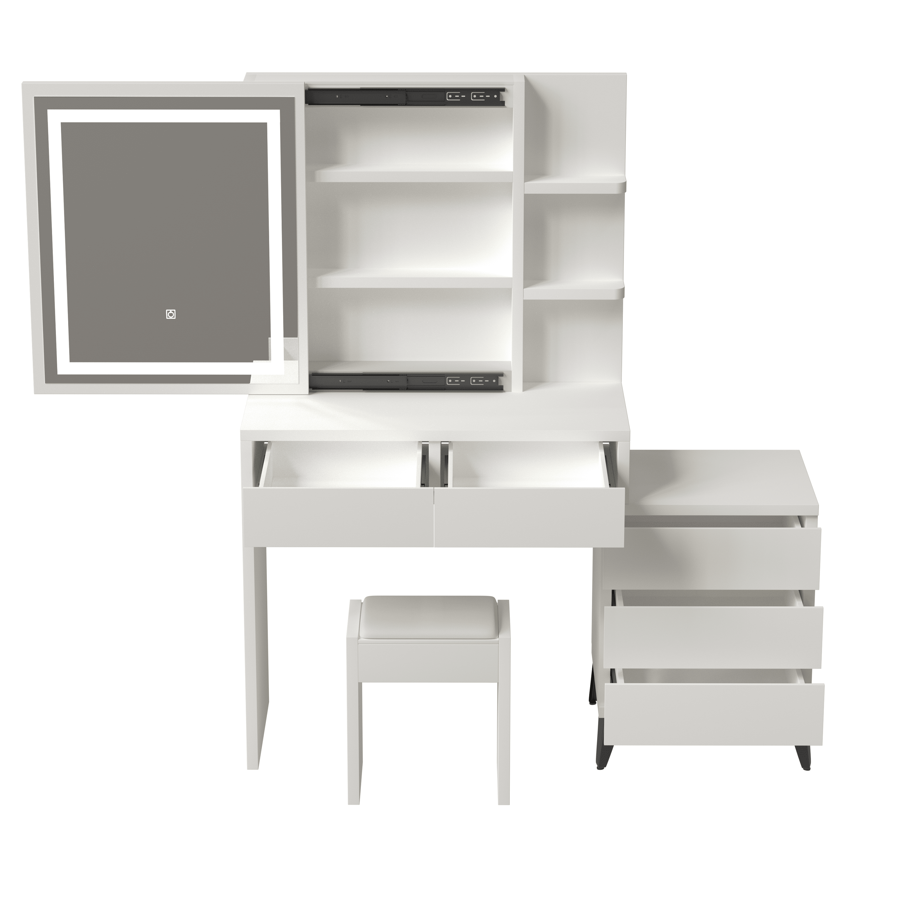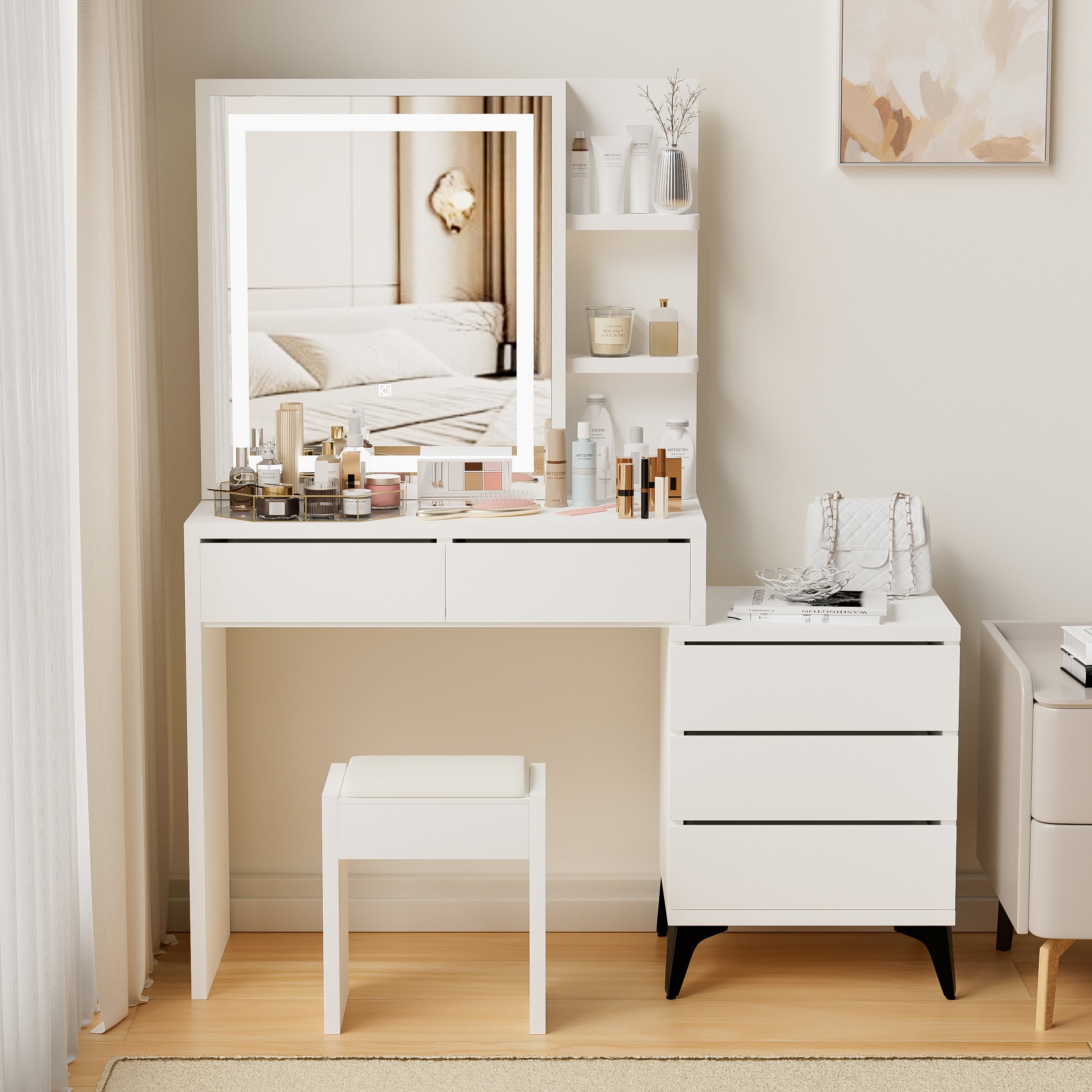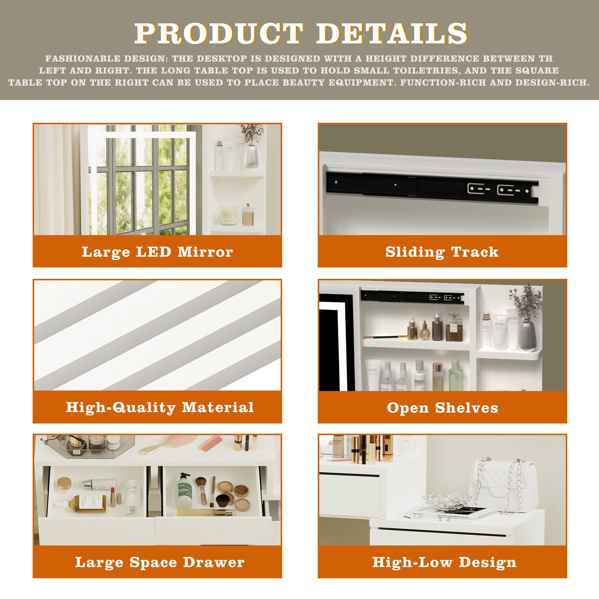 Fashionable design: The desktop is designed with a height difference between the left and right. The long table top is used to hold small toiletries, and the square table top on the right can be used to place beauty equipment. Function-rich and design-rich.
