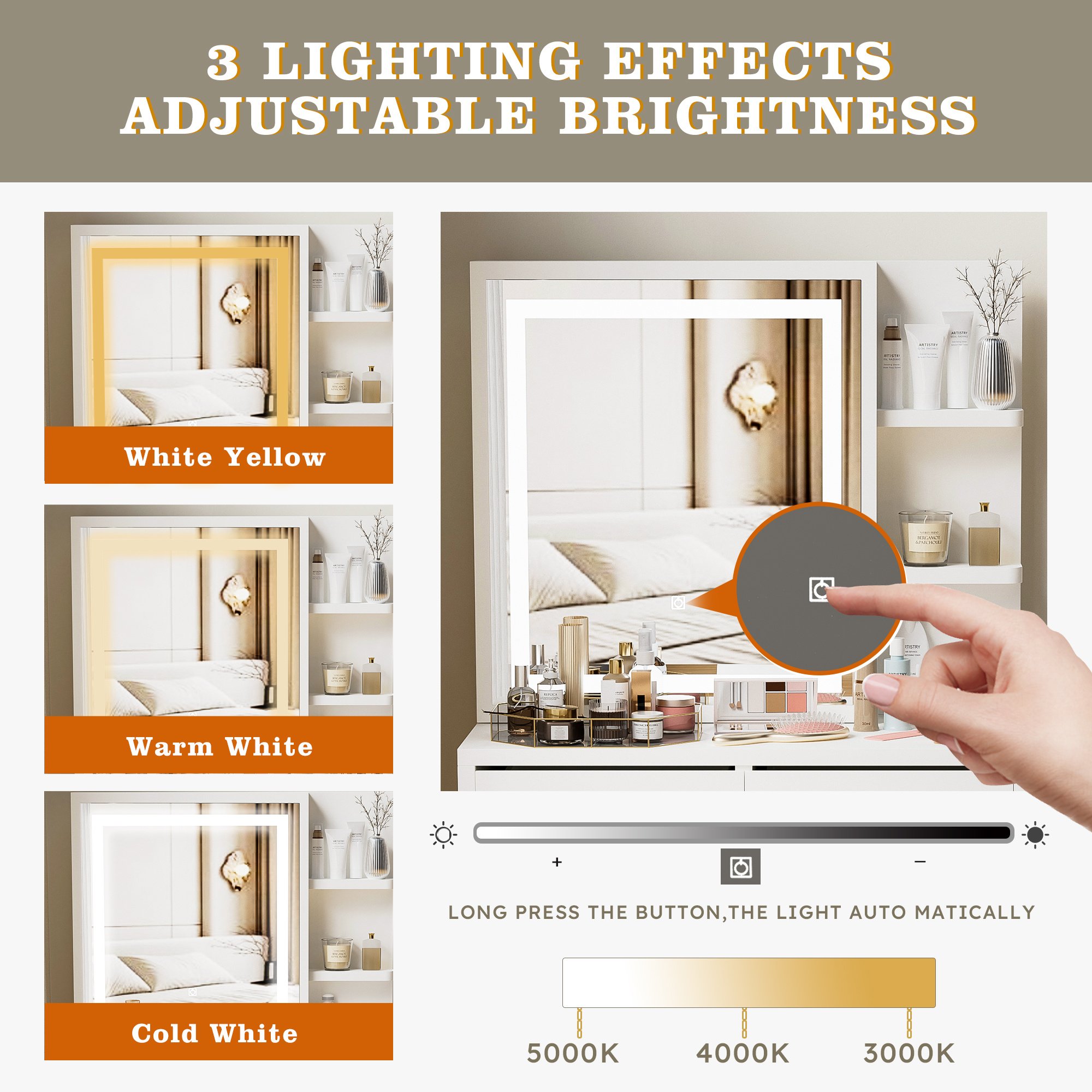 Large LED mirror: a cosmetic mirror that can be pushed and pulled left and right, with three color temperatures that can be adjusted, and each color temperature can achieve 3000-5000K brightness adjustment to meet your different lighting needs.