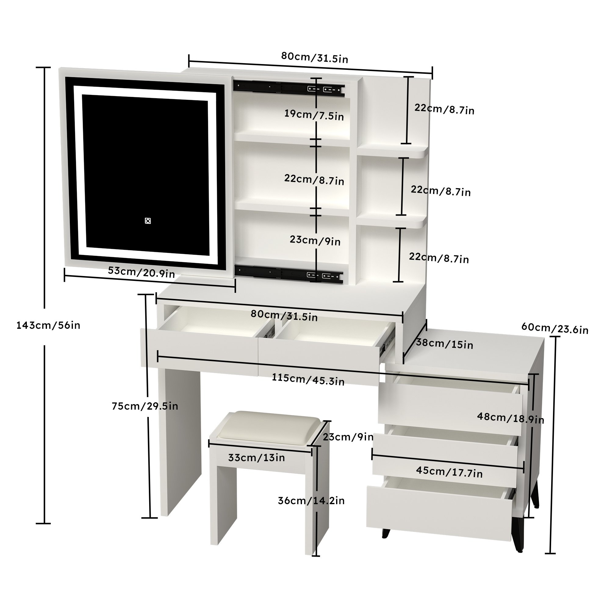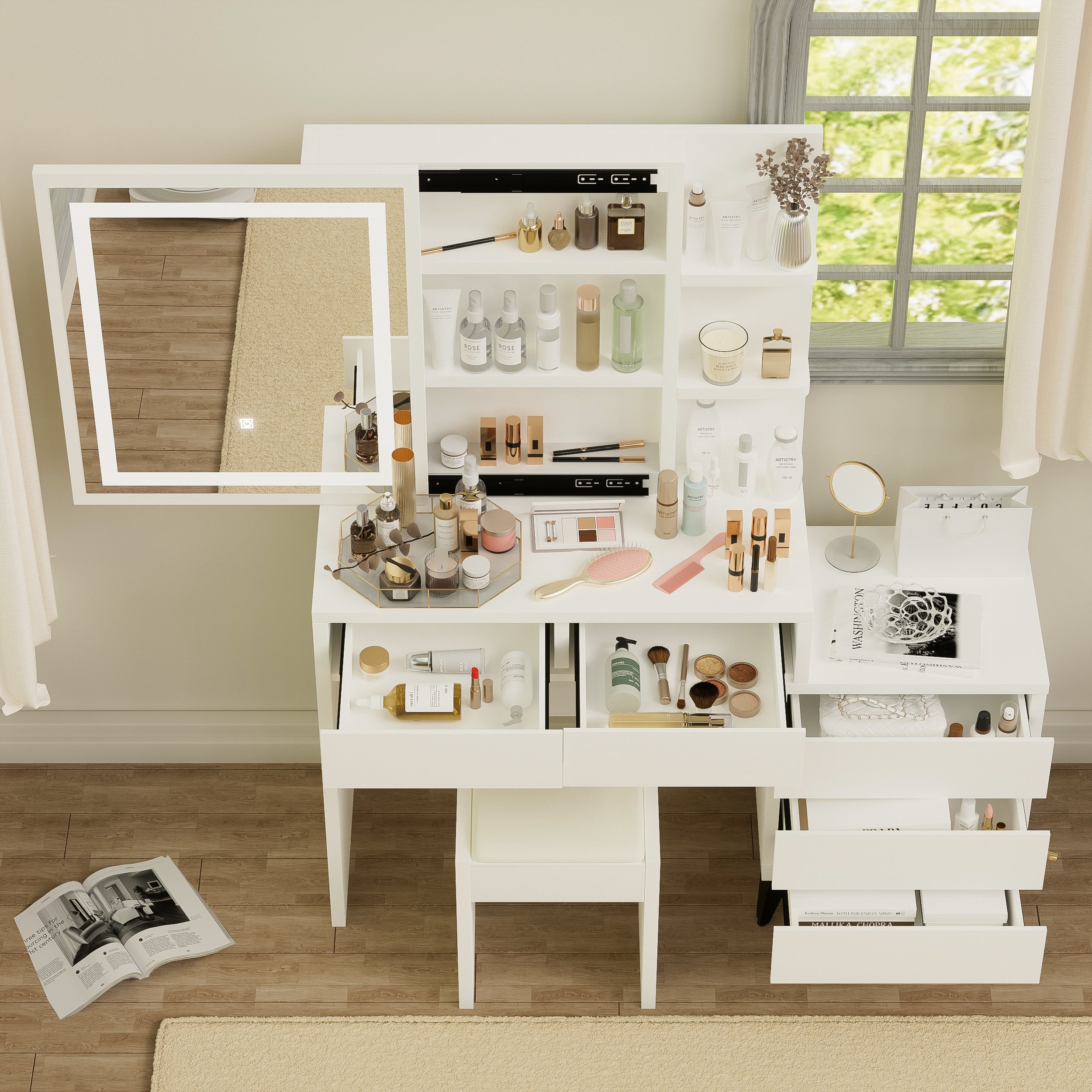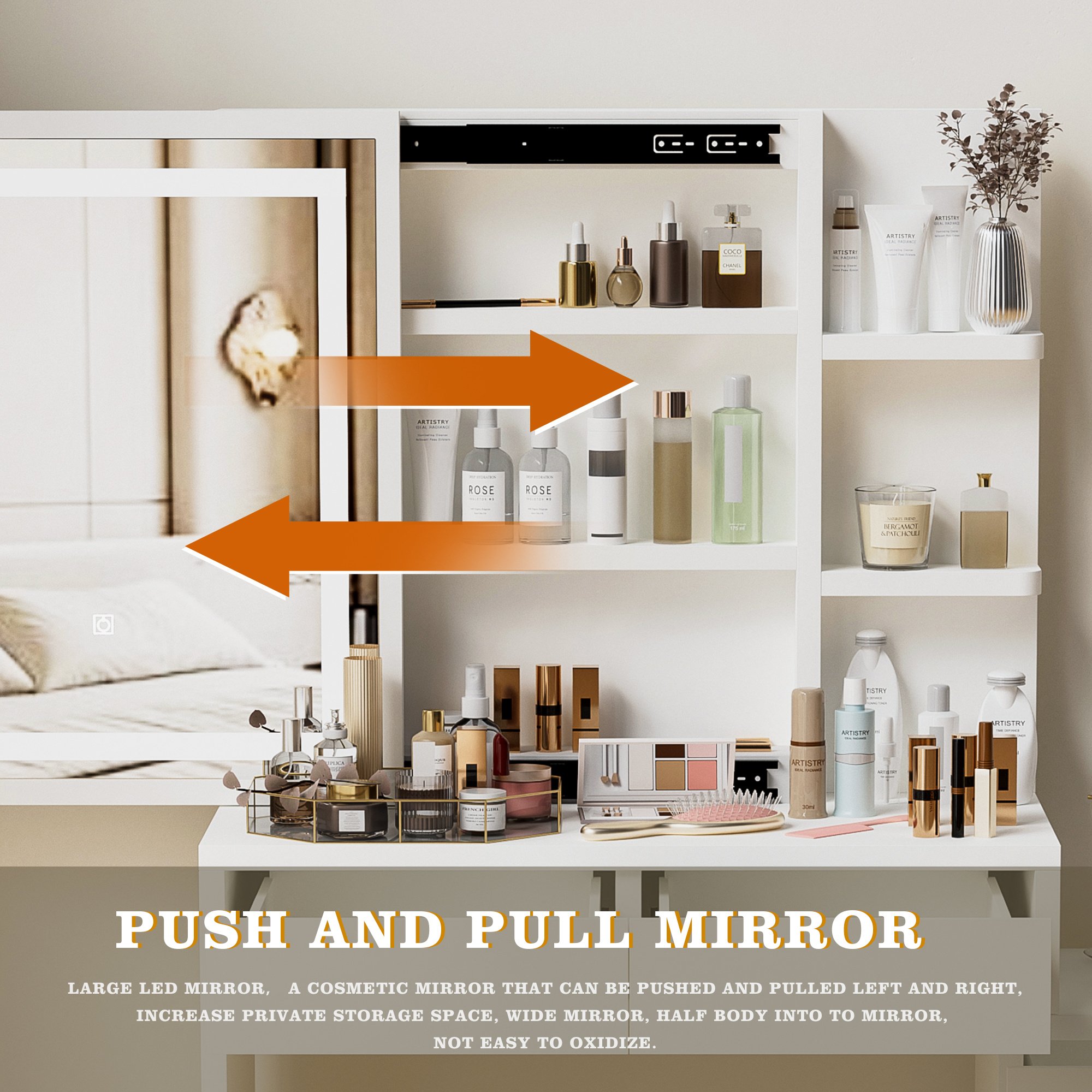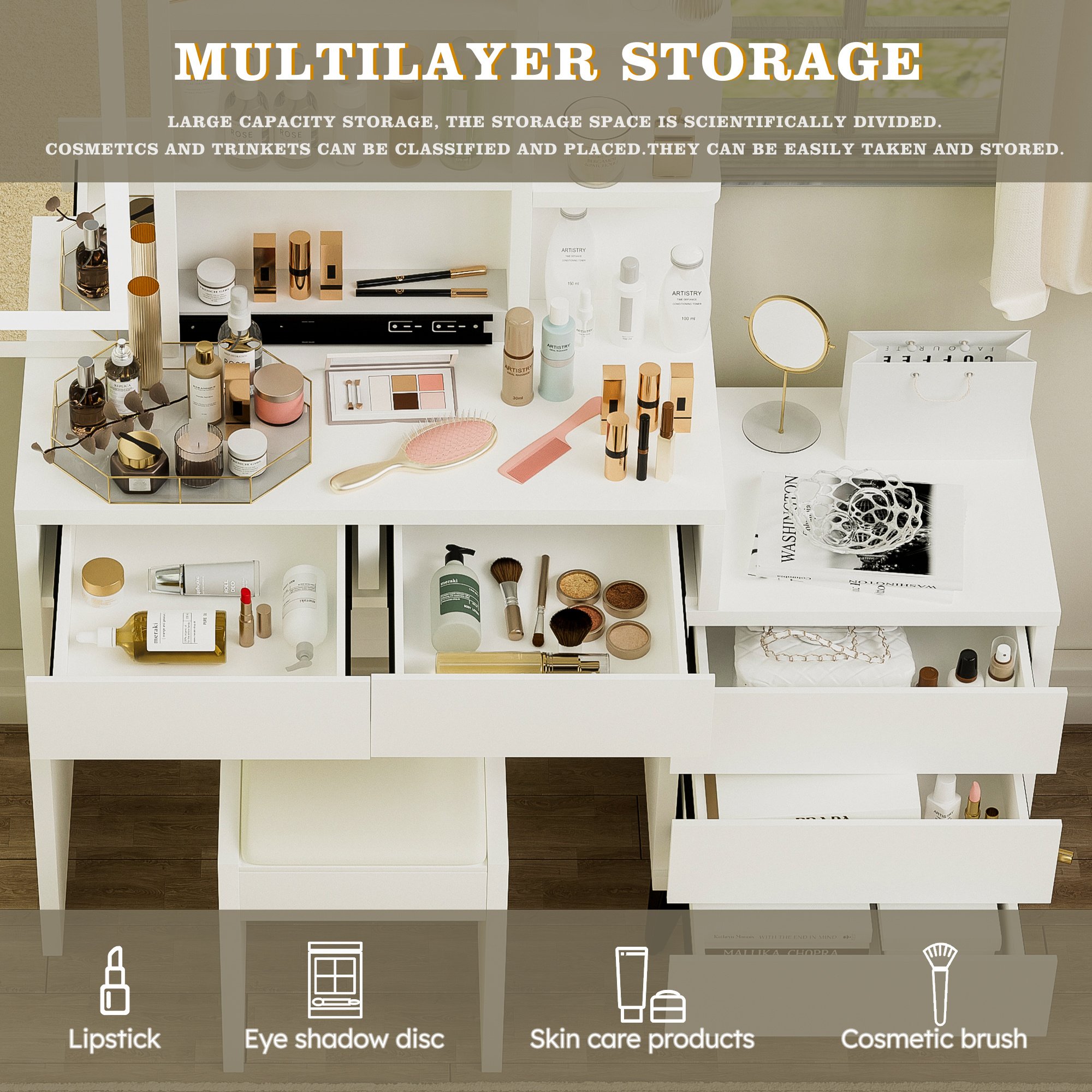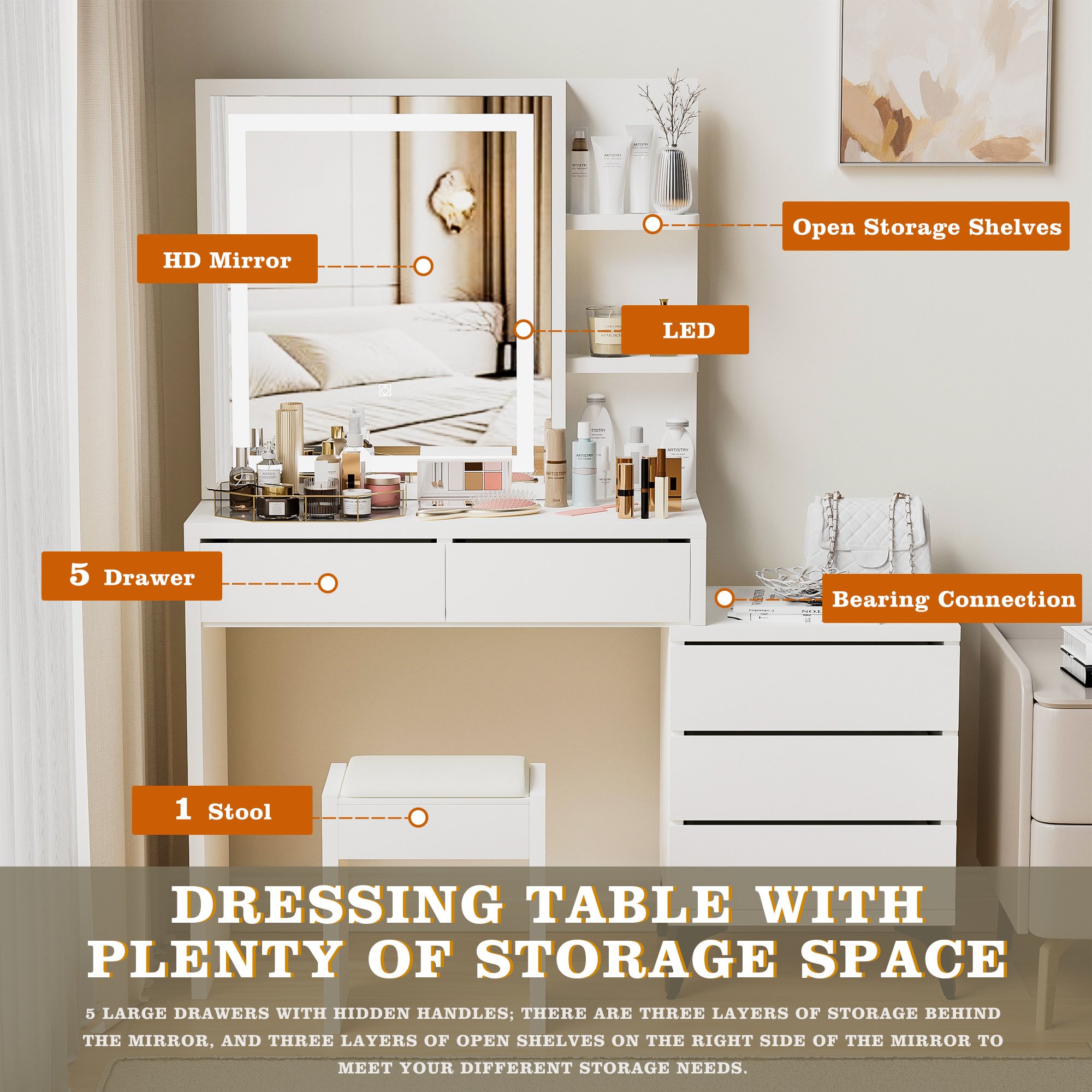 Dressing table with plenty of storage space: 5 large drawers with hidden handles; There are three layers of storage behind the mirror, and three layers of open shelves on the right side of the mirror to meet your different storage needs.