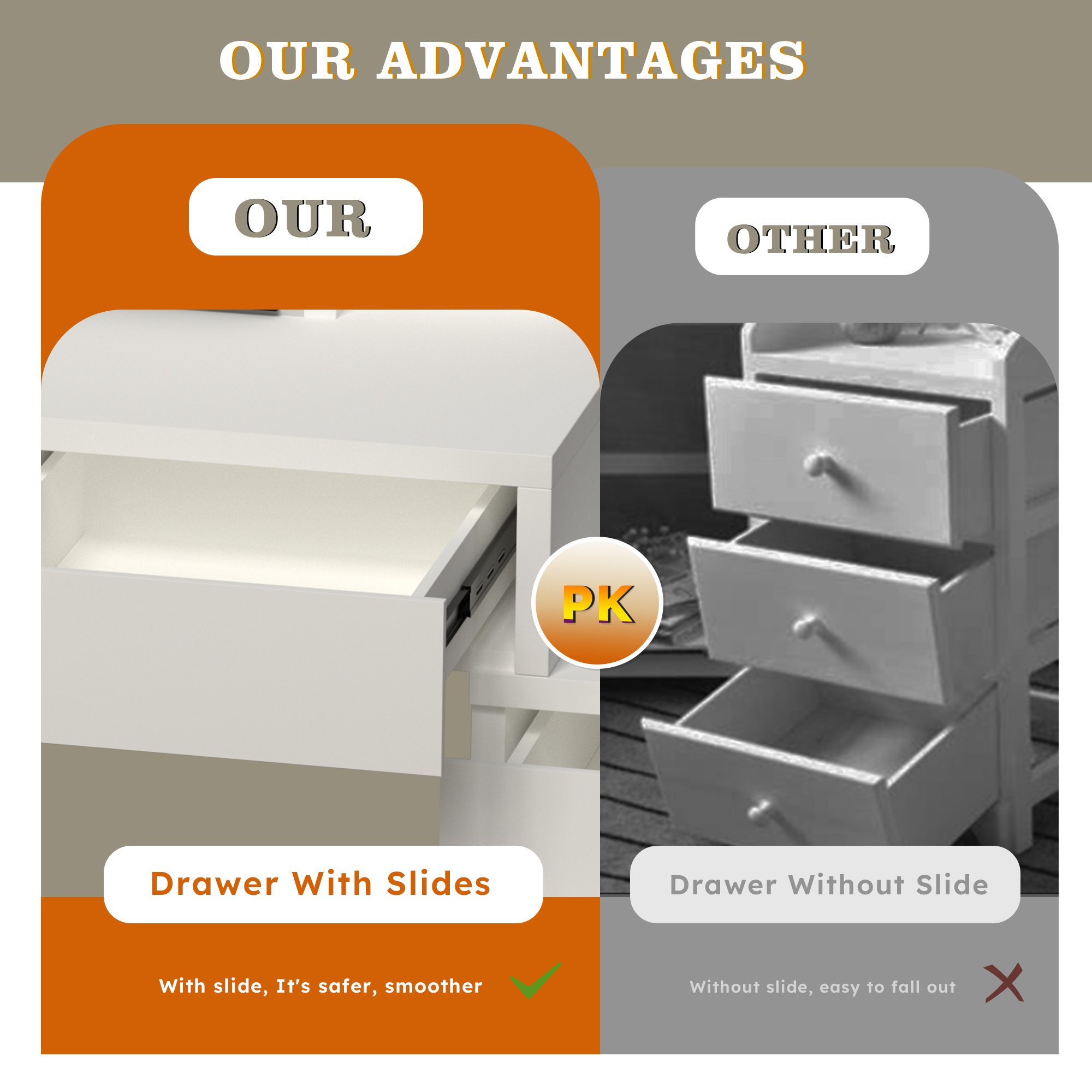 All drawers with slide rails: Drawer with slide rails, pull the handle feeling silky smooth, strong stability. It's safer than a drawer without a slide. It won't fall.
