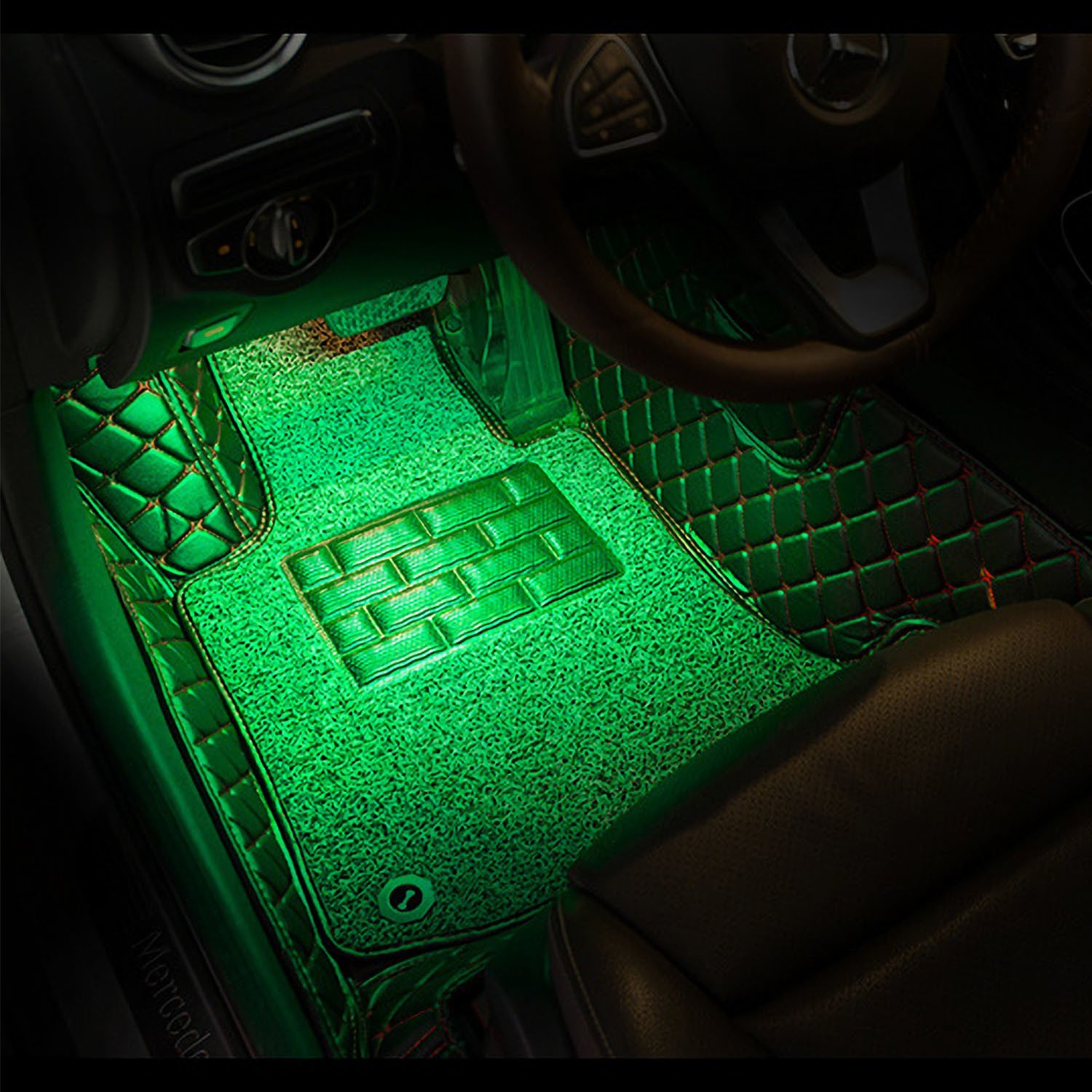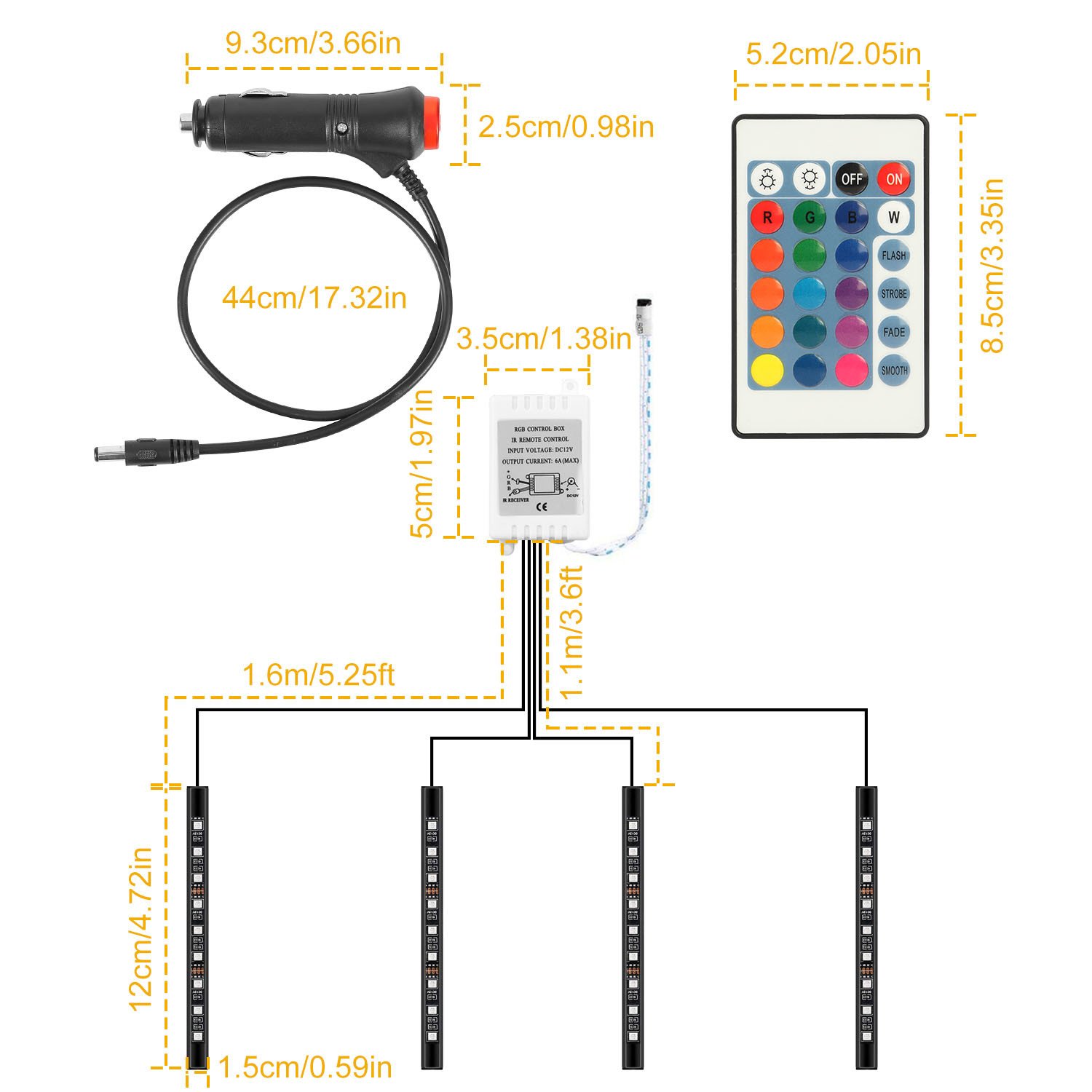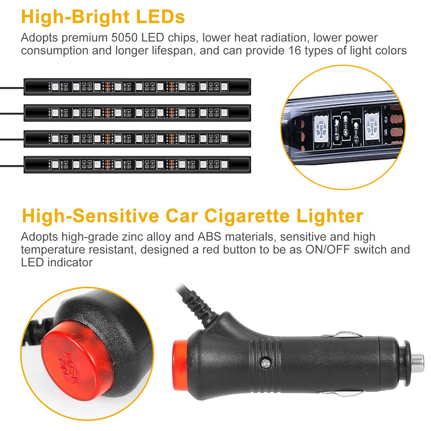 **COOL DECORATIVE ATMOSPHERE LIGHT*:Can provide 16 static light colors and 4 light modes(flash,strobe,fade and smooth) with gradient colors to create and render romantic atmosphere for your car interior. Each of our LED light strips adopts 9pcs high-quality 5050 LED chips and package comes with 4pcs flexible LED light strips to meet your needs.
