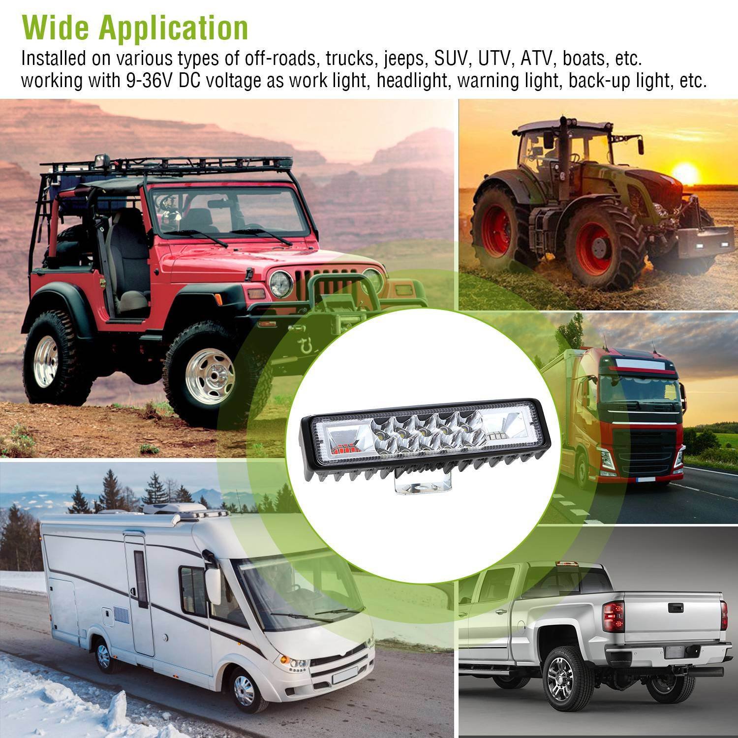 **WIDE APPLICATION*:Can be used as work light,headlight,warning light,back-up light,etc. installed on various types of off-roads,trucks,jeeps,SUV,UTV,ATV,boats,etc. working with 9-36V DC voltage.