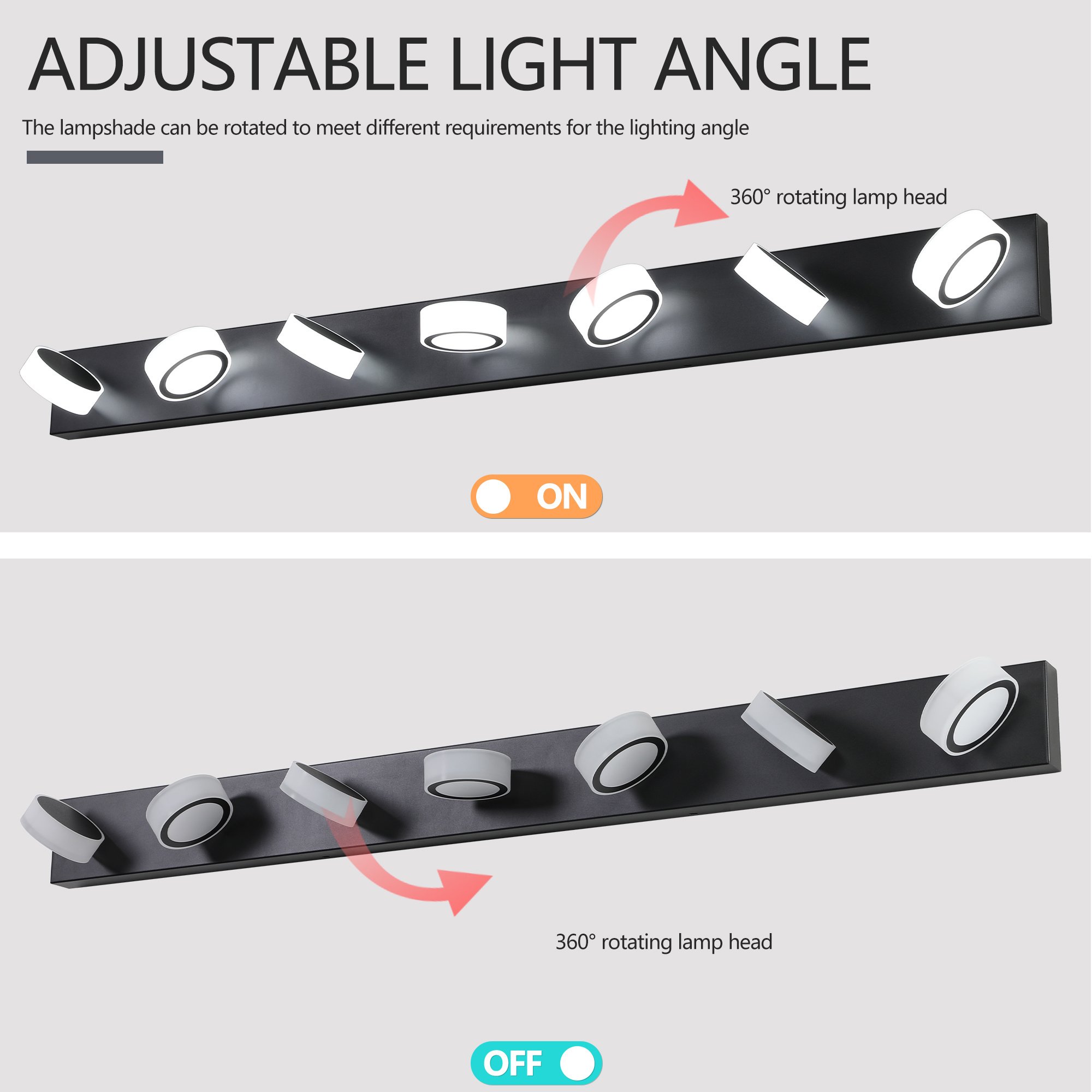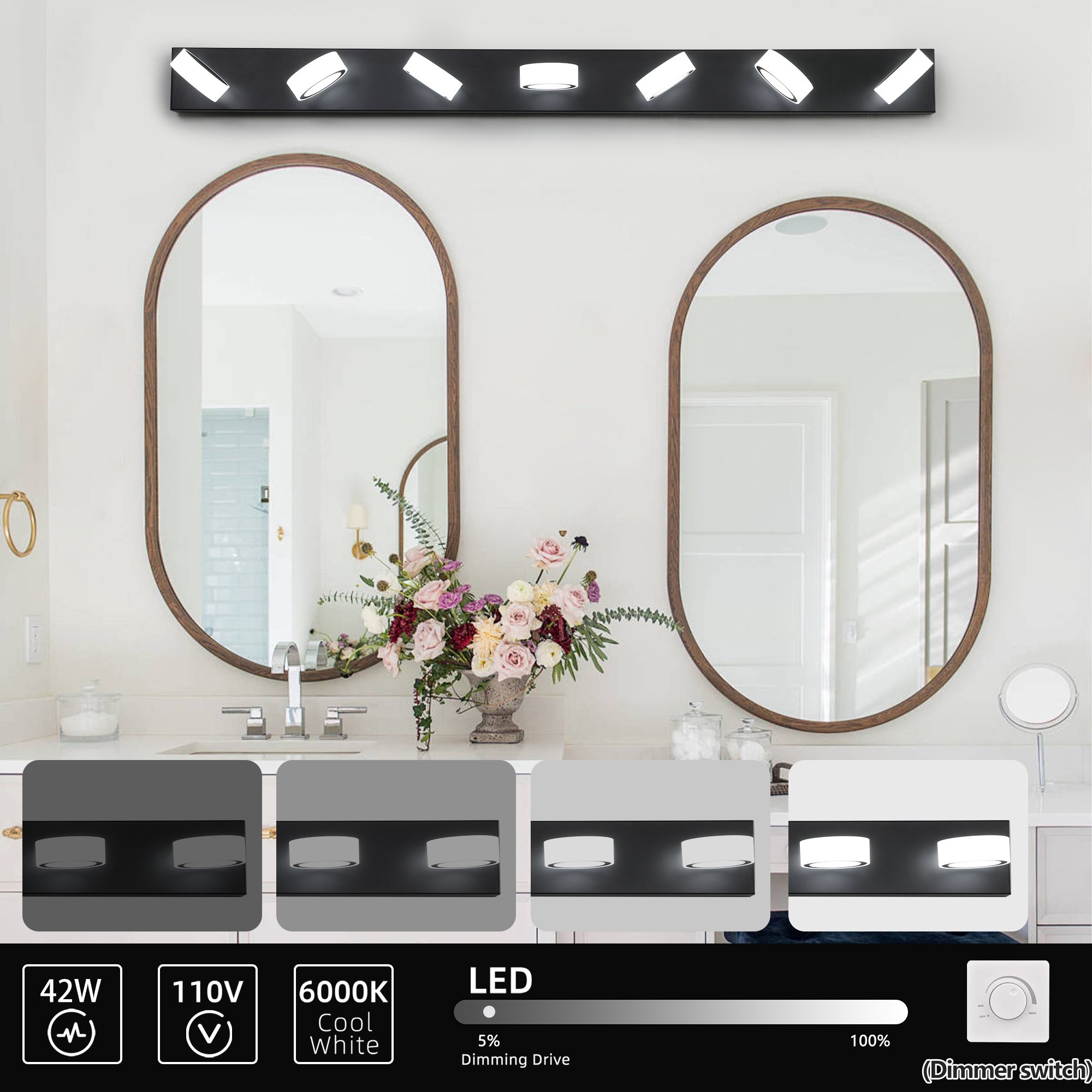 Modern 7-Light LED Vanity Light Fixture - Black Iron Finish with Acrylic Shades - Energy-EfficientMaterial: Iron & AcrylicColor: BlackLight source type: LEDNumber of lamp holders: 7Brightness adjustment: Support dimming (dimmer not included)Applicable space: Bathroom, Dressing room, etcInstallation mode: Wall hangingPower Supply Mode:Hard-WiredColor Temperature:6000KWattage: 42 WattsVoltage: 100-120VSize: Please look at the "Product Dimensions" column or refer to the product picture
