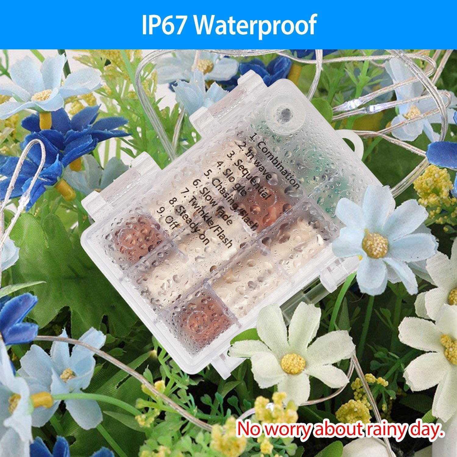 *IP65 Waterproof*:104 LED lights and 8 strings; 13 LED lights per string. Each string; designed with super soft copper wire; can be moderately bent to any shape; having a long service time. The waterproof level of the battery box reaches IP67. It is protected from water and dust; suitable for varieties of weather.
