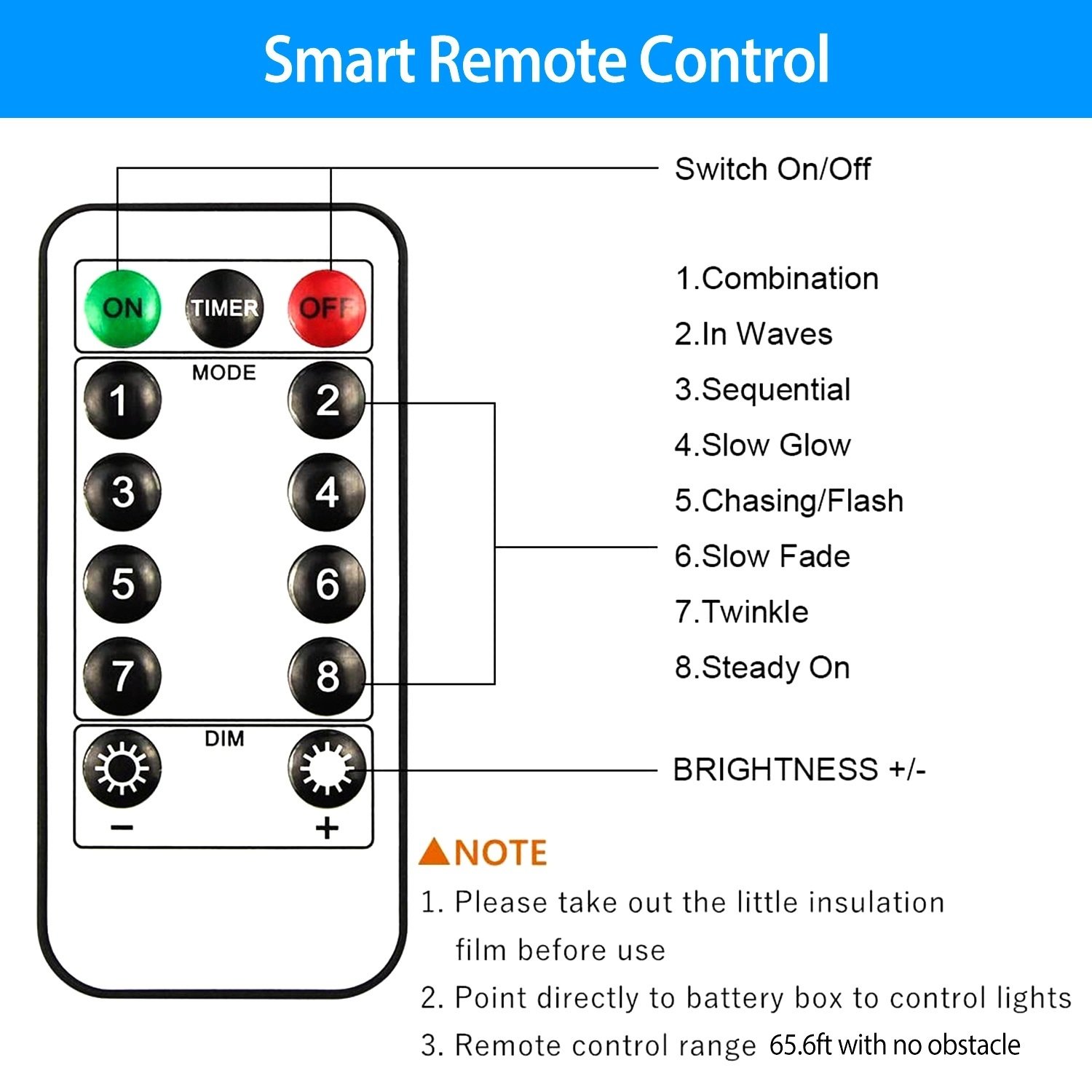 *Battery Powered & Remote Control*:Requires 3*AA batteries(NOT INCLUDED). The remote controller can be used to set work time; choose lighting mode; adjust light brightness; turn on/off; which is very convenient. And 1 to 8 number mean 8 lighting modes; and the remote control distance is 16 feet.