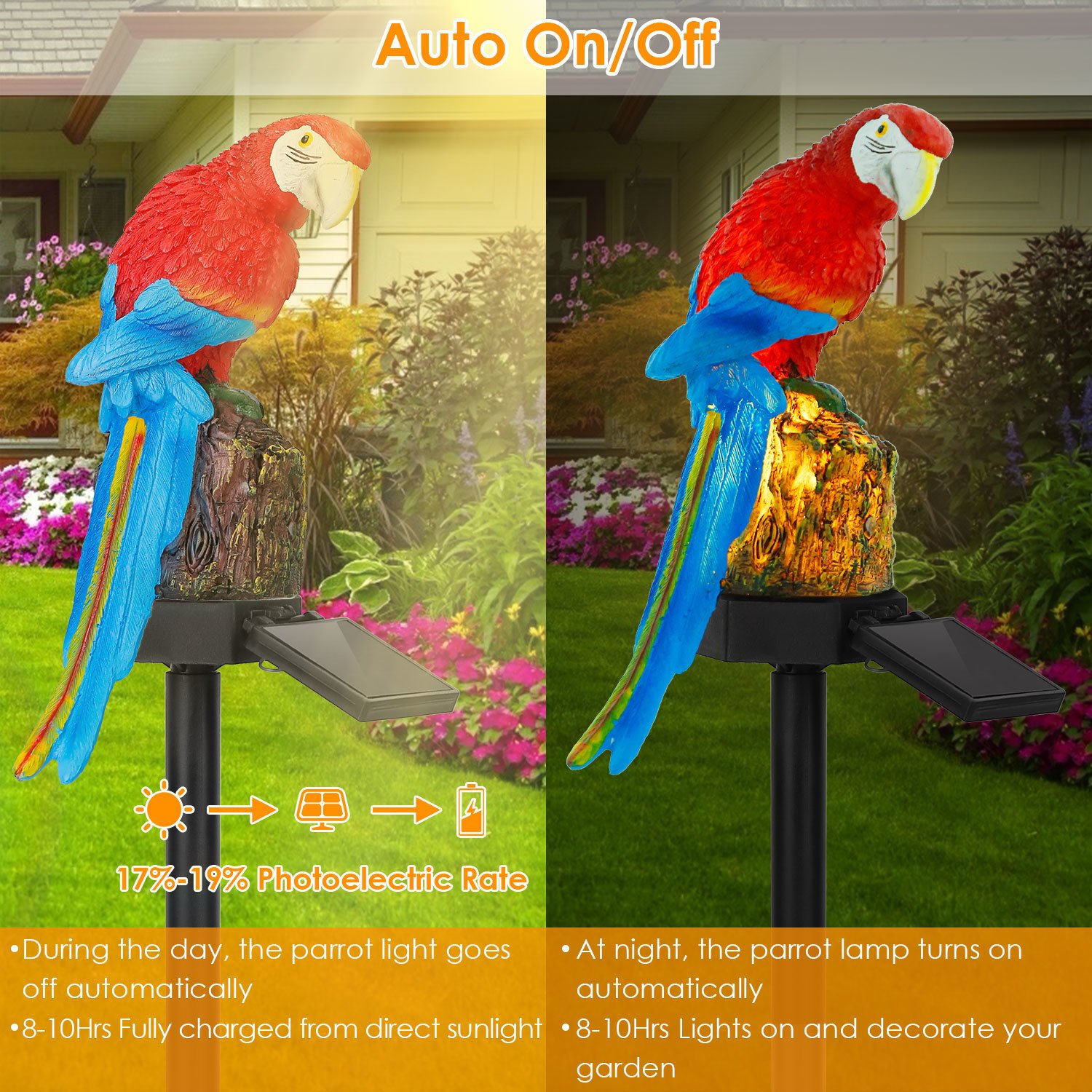 *Auto On/Off*:This garden solar outdoor light used with a solar panel,powered by a solar battery charging system that supports about 10 hours operations after fully charged. Our parrot light emits a delight full warm white glow to your driveway,patio,or flower beds. Let it decorate your garden during the day,convert sunlight into electricity,and when night falls,it will automatically light up to illuminate your garden and pathway.