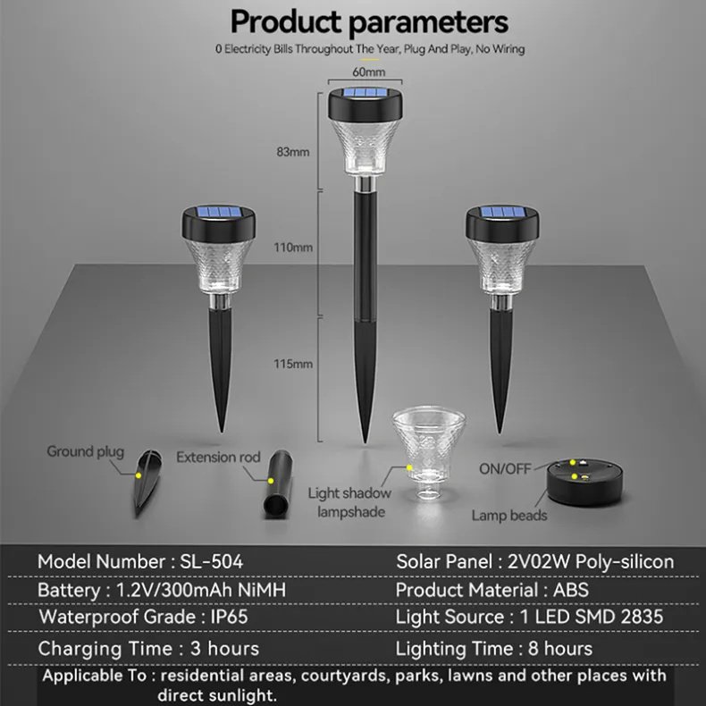This solar landscape light is made of durable, thickened, corrosion-resistant ABS material that is durable and solid to serve you for years. 100% solar powered outdoor lights with solar panel which will absorbs sunlight during the day and light up at night automatically to save energy. No need expensive electricity bill and extra workforce.