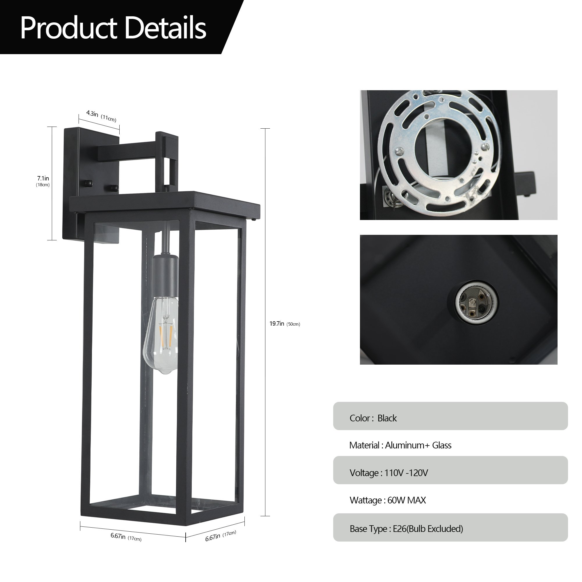 Set of 2 Modern Outdoor Wall Lanterns with Black Metal Frame and Clear GlassColor: BlackMaterial: Aluminum + GlassBulb type & quantity: Set of 2,each one needs a bulb (The product without bulbs!)Bulb Wattage: Each bulb max 60WApplicable voltage: 110-120VControl Mode:On-Off controlPower Supply Mode:Hard-WiredSize: Please look at the "Product Dimensions" column or refer to the product picture
