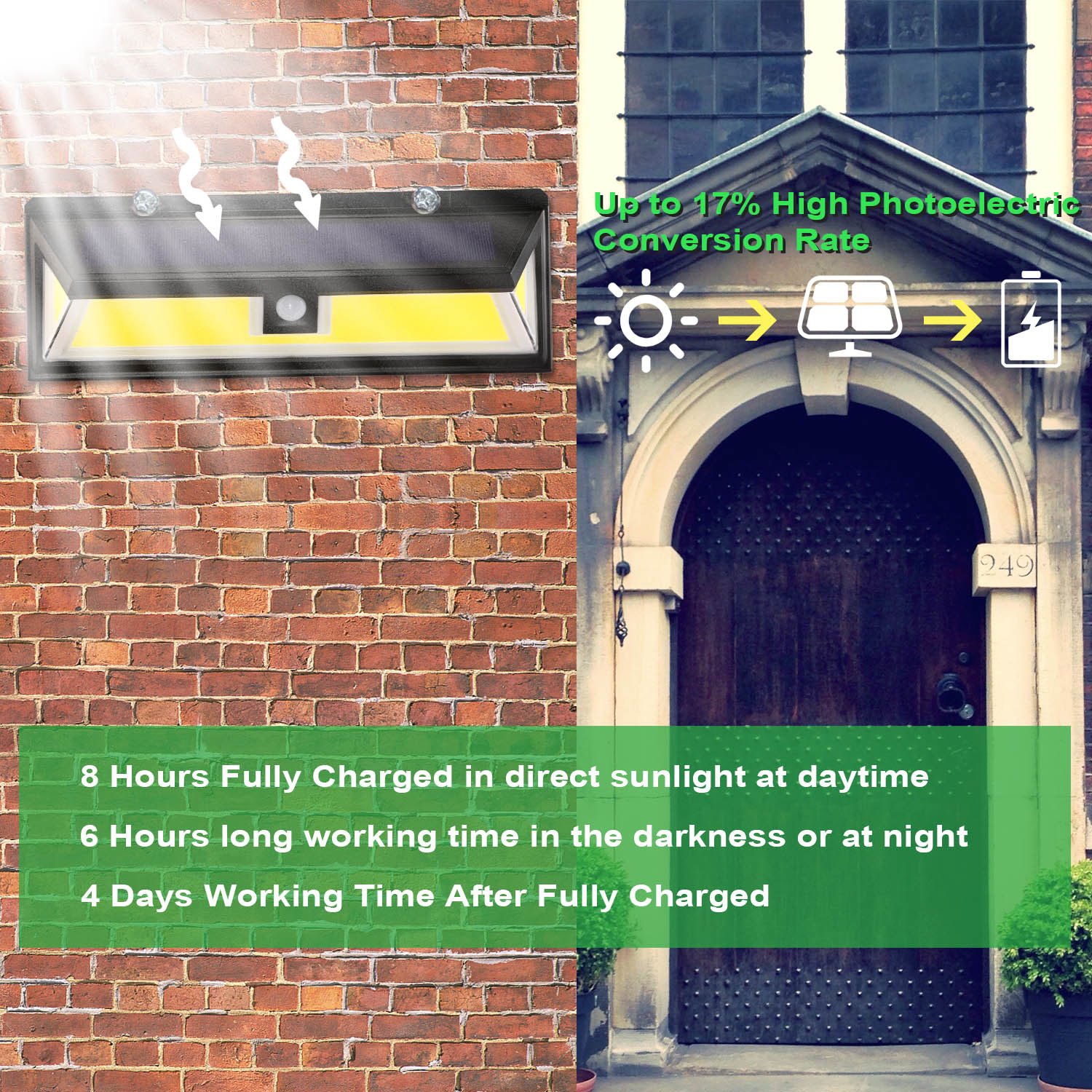 *4 Days Working Time*:Its solar panel with 17% high photoelectric conversion can effectively absorb the sunlight on the day and convert sunlight into electricity to fully charge the inbuilt dual 2200mAh about 7 hours. Auto on at night when motion is detected in darkness or at night,and become bright for 30 seconds. If the solar light lights up 50 times a night,it can work continuously for 4 days,durable and eco-friendly.
