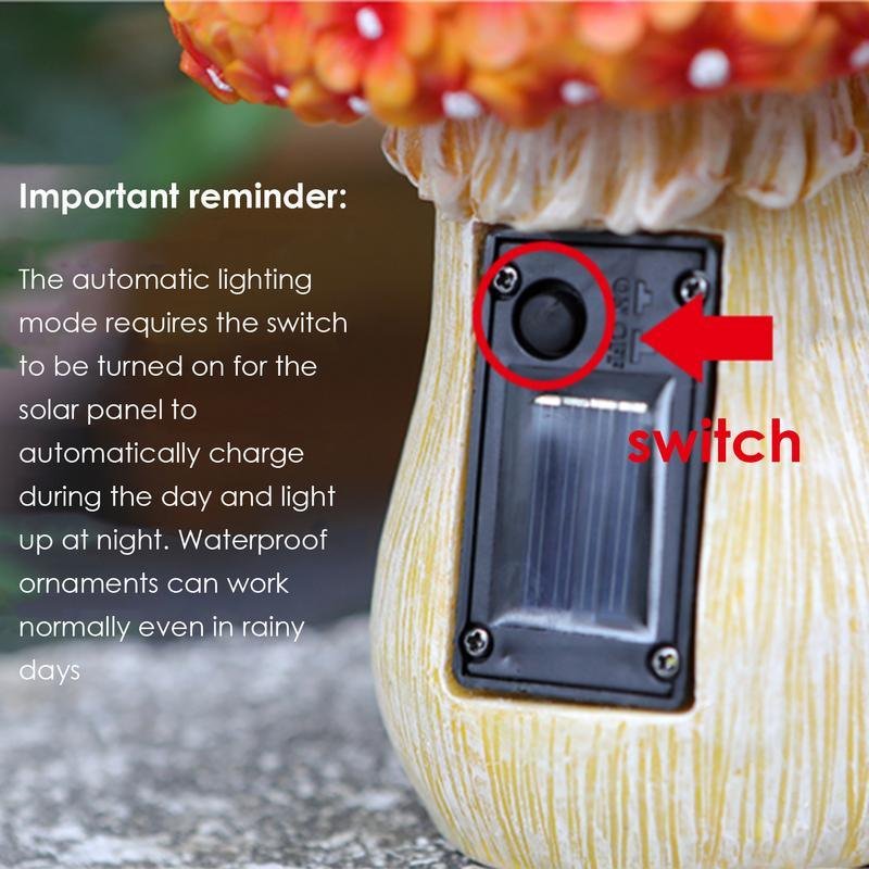 2.Easy to Operate: Simply turn on the switch, place it in a sunny spot during the day, and enjoy its soft glow at night. This solar mushroom light requires no complicated wiring or installation and is powered by solar energy.