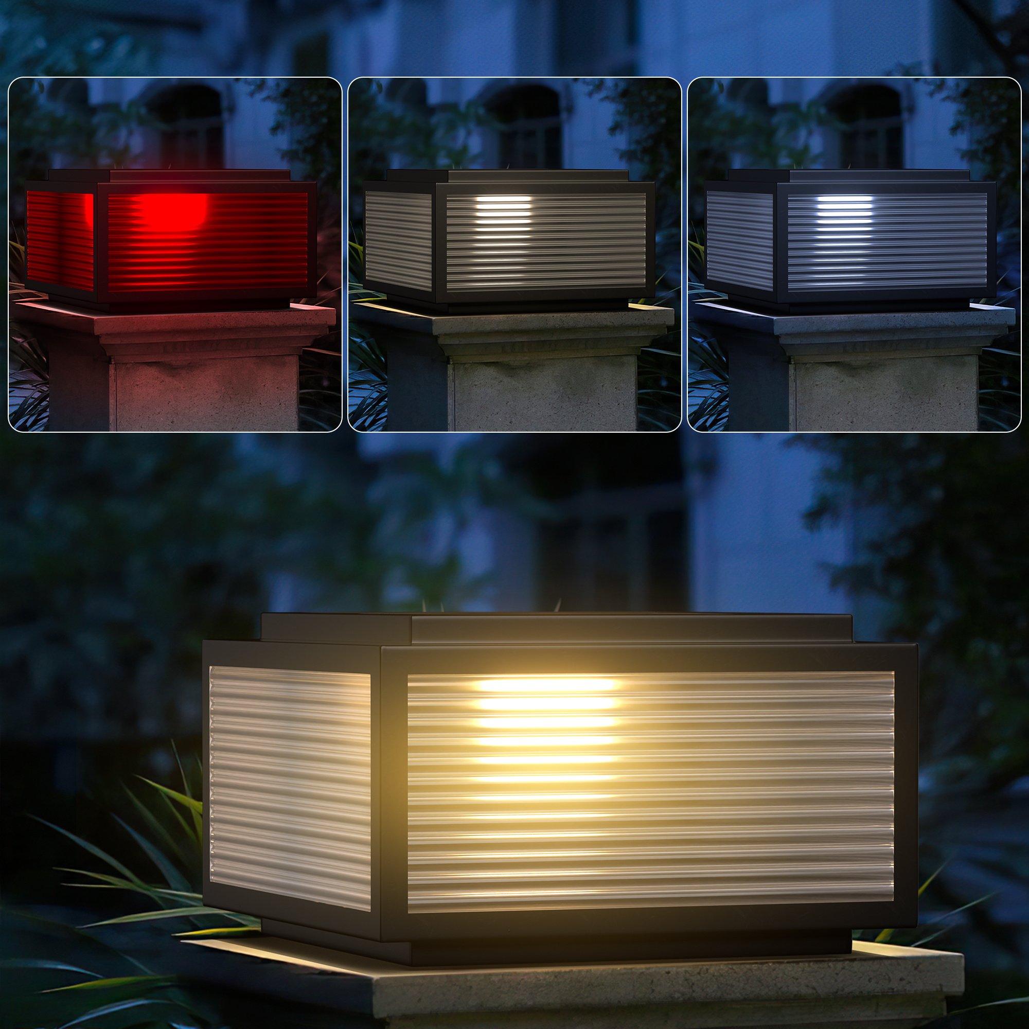 Pillar lights solar powered features a durable metal frame and strong glass housing, ensuring long life and consistent performance. It adds style and strength to your garden, patio or wall post. The light offers a variety of light color options - warm, white, cool and red. This allows you to tailor your lighting experience to your mood, event or the aesthetic you wish to achieve in your garden, patio or wall column.