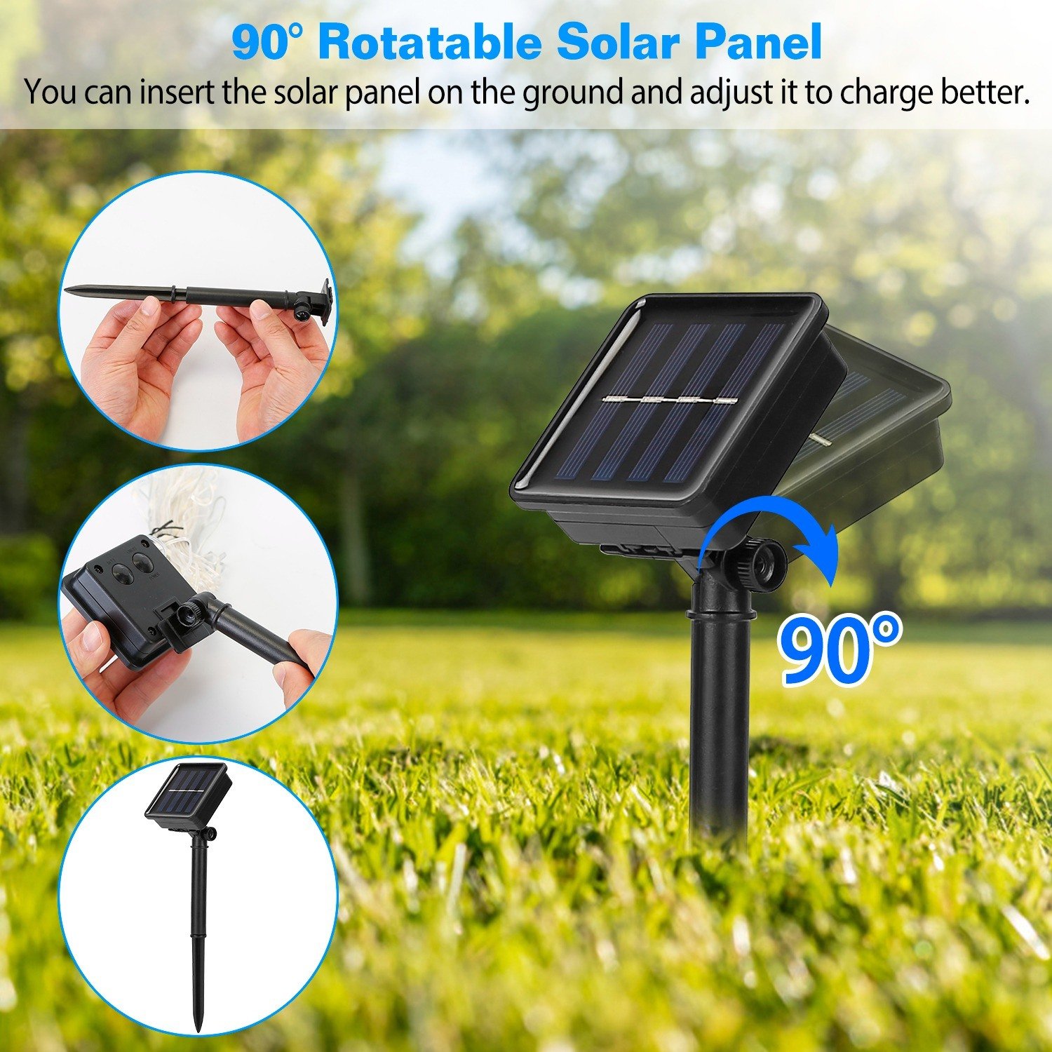 *90° Rotatable Solar Panel*:After inserting it on the ground,you can adjust the solar panel to make it better charge during the day.(Notice:The solar panel need to be full charged for 6 hours before the first use. Please put it under the direct sunshine to ensure better charge.)