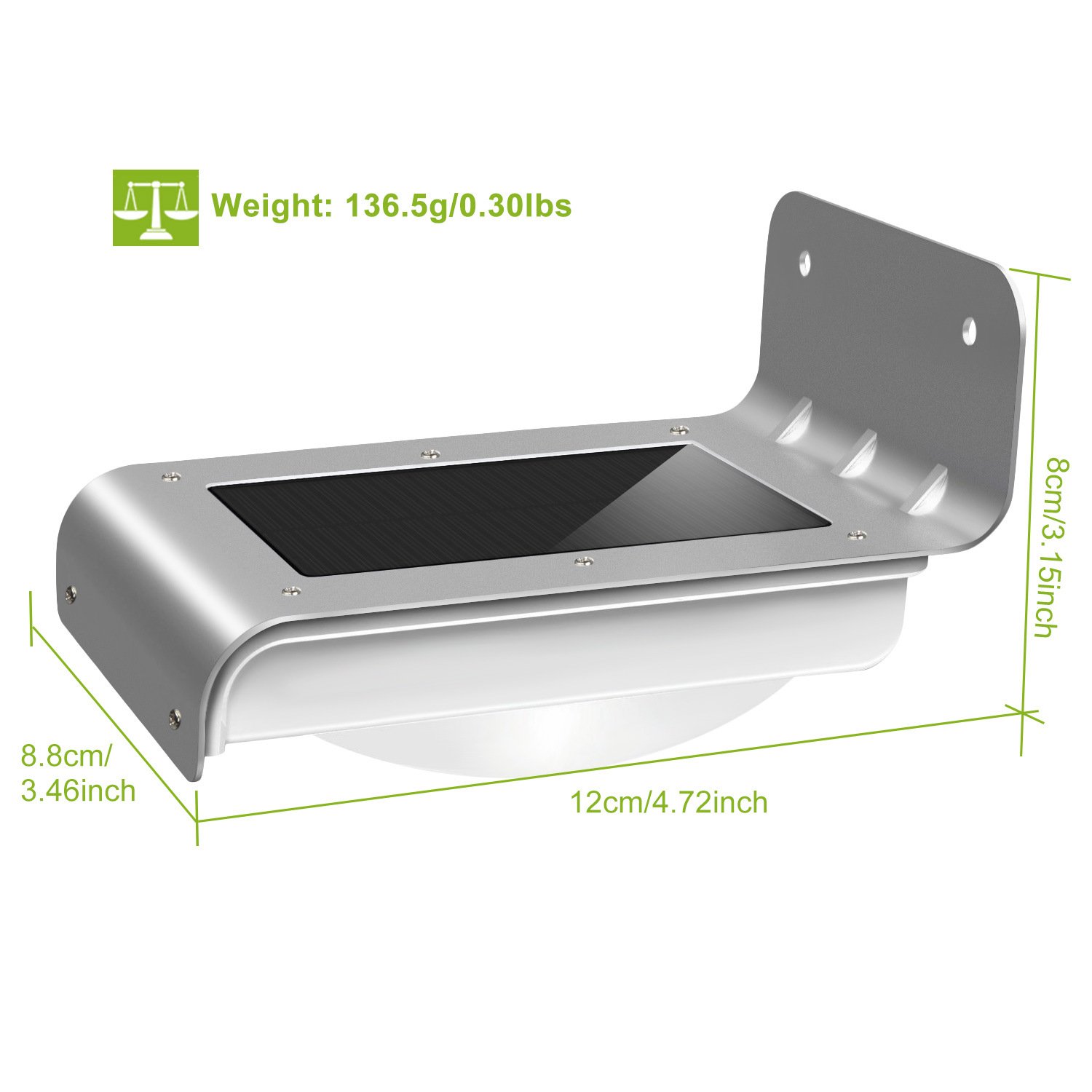 **UPGRADED INBUILT MOTION SENSOR*:Adopts advanced PIR motion sensor offers 120° wide sensing angle can detect motions up to 3m/9.84ft. The sensing range and sensitivity of our solar wall lights are both 20% higher than general LED lights,bringing ultimate using experience.