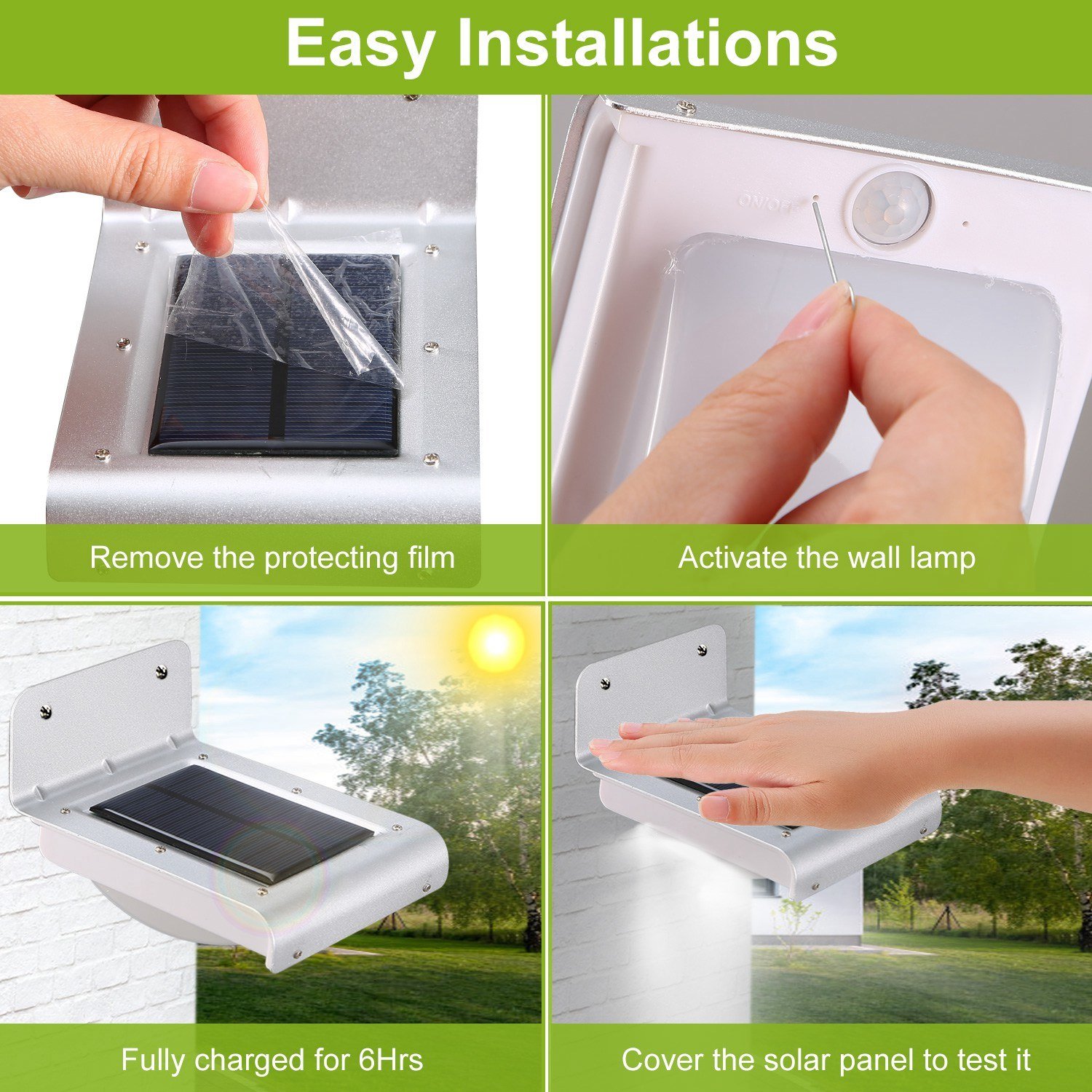 **IP65 WATERPROOF & WIDELY USED*:IP65 waterproof and heatproof performance is optimal for free outdoor use even in rainy,snowy or other weather conditions. Simply find a place with sufficient sunshine and fix the light with supplied screws onto it. Widely used in your garden,stairs,deck,porch,patio,pond,garage,driveway,or any outdoor location that needs a light.
