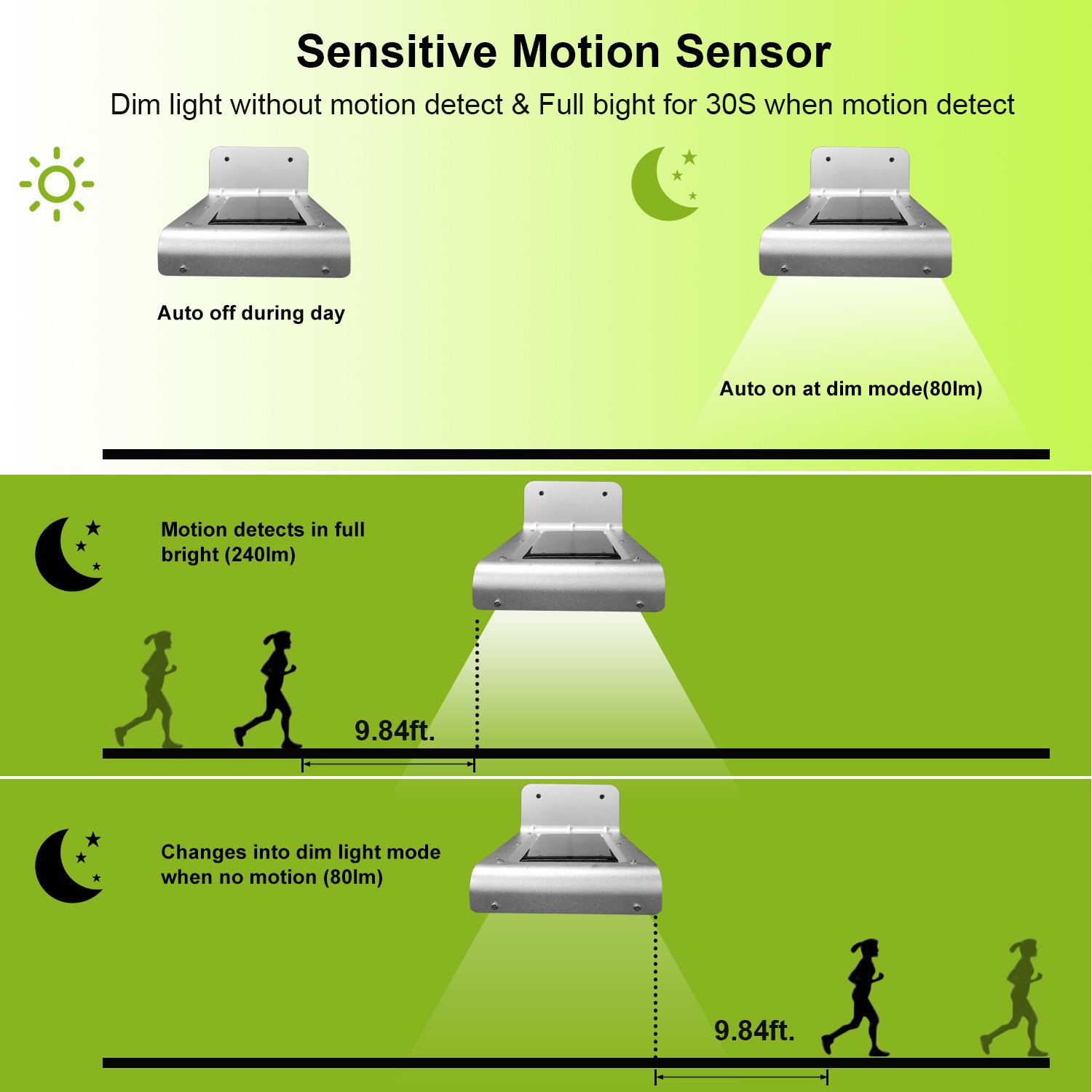**ENERGY-SAVING WORKING MODE*:Auto on in dim light mode at night and changes into full bright mode when motion is detected within 3m/9.84ft in darkness or at night,stays for 30 seconds. Less power consumption and energy-saving.
