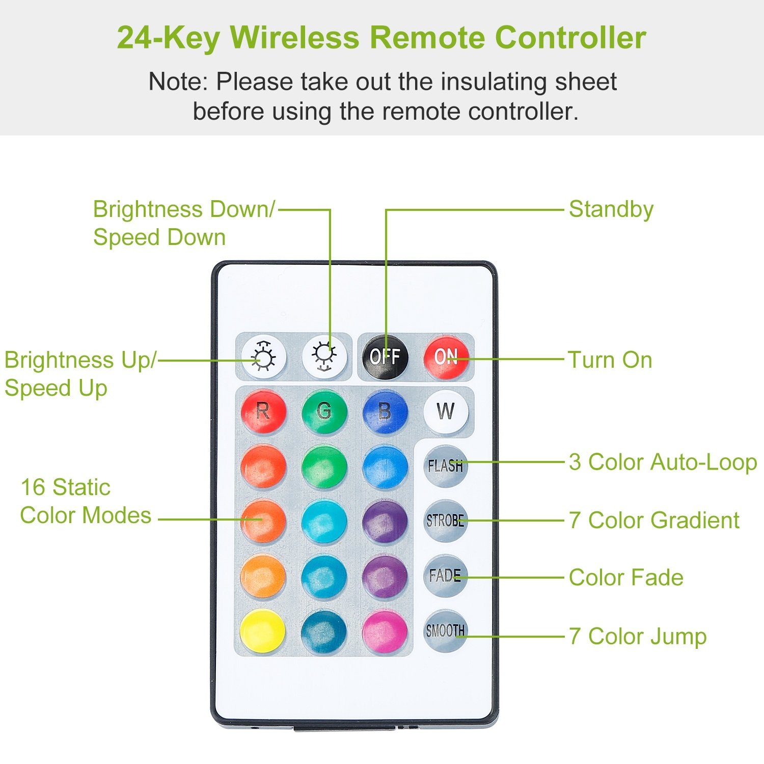 *24-Key Remote Controller*:With the remote controller,you can easily adjust the light mode as you like while watching TV or movie. Besides 16 static colors,Flashing,Strobing,Fading,and Smooth lighting modes are provided.