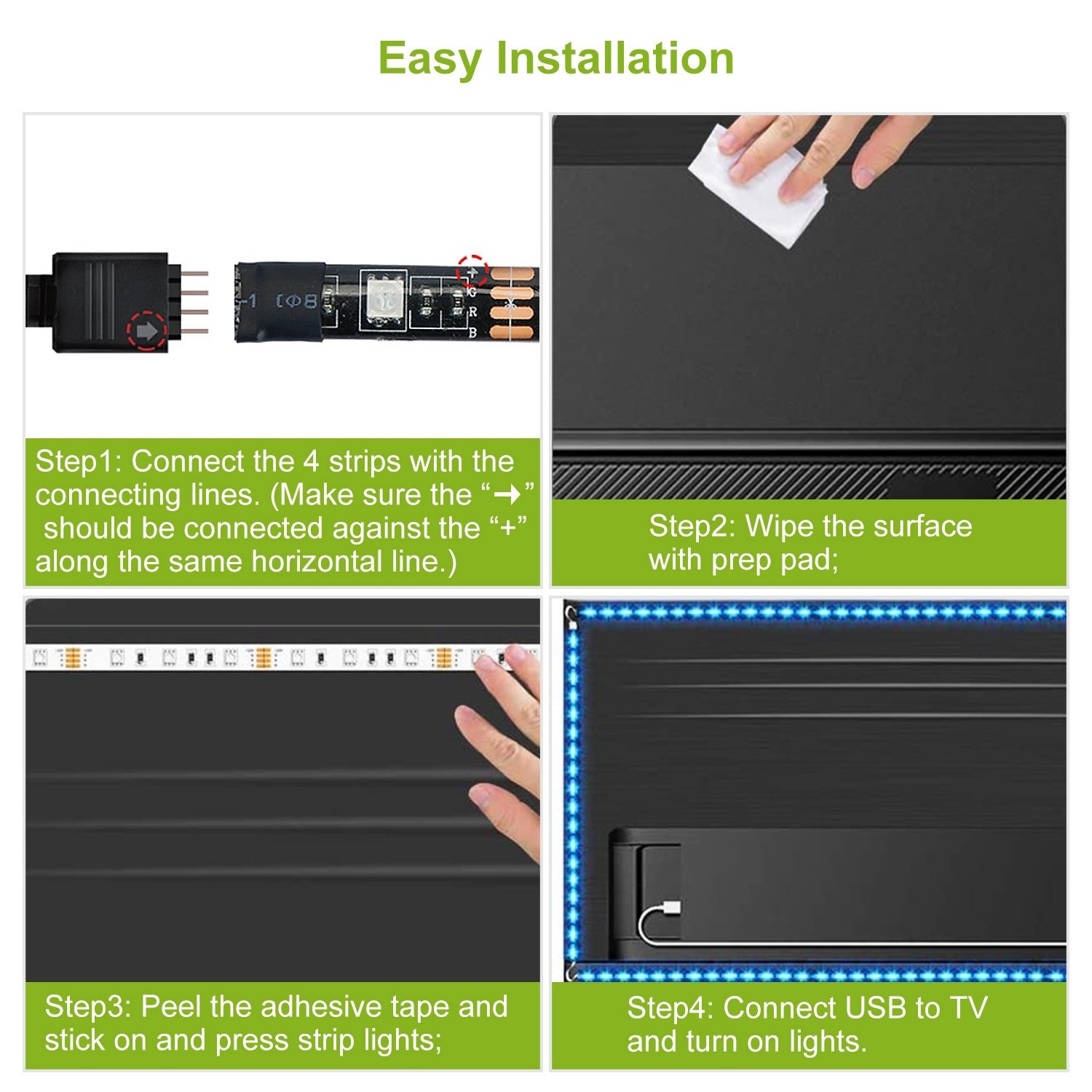 *Adjustable Length & Easy Installation*:LED strip light is 6.56ft,which can be cut with scissors on the cut marks(white lines) to fit the desired size of your TV. Then just tear off the strong adhesive on the lights tape to install it on the back of your TV.