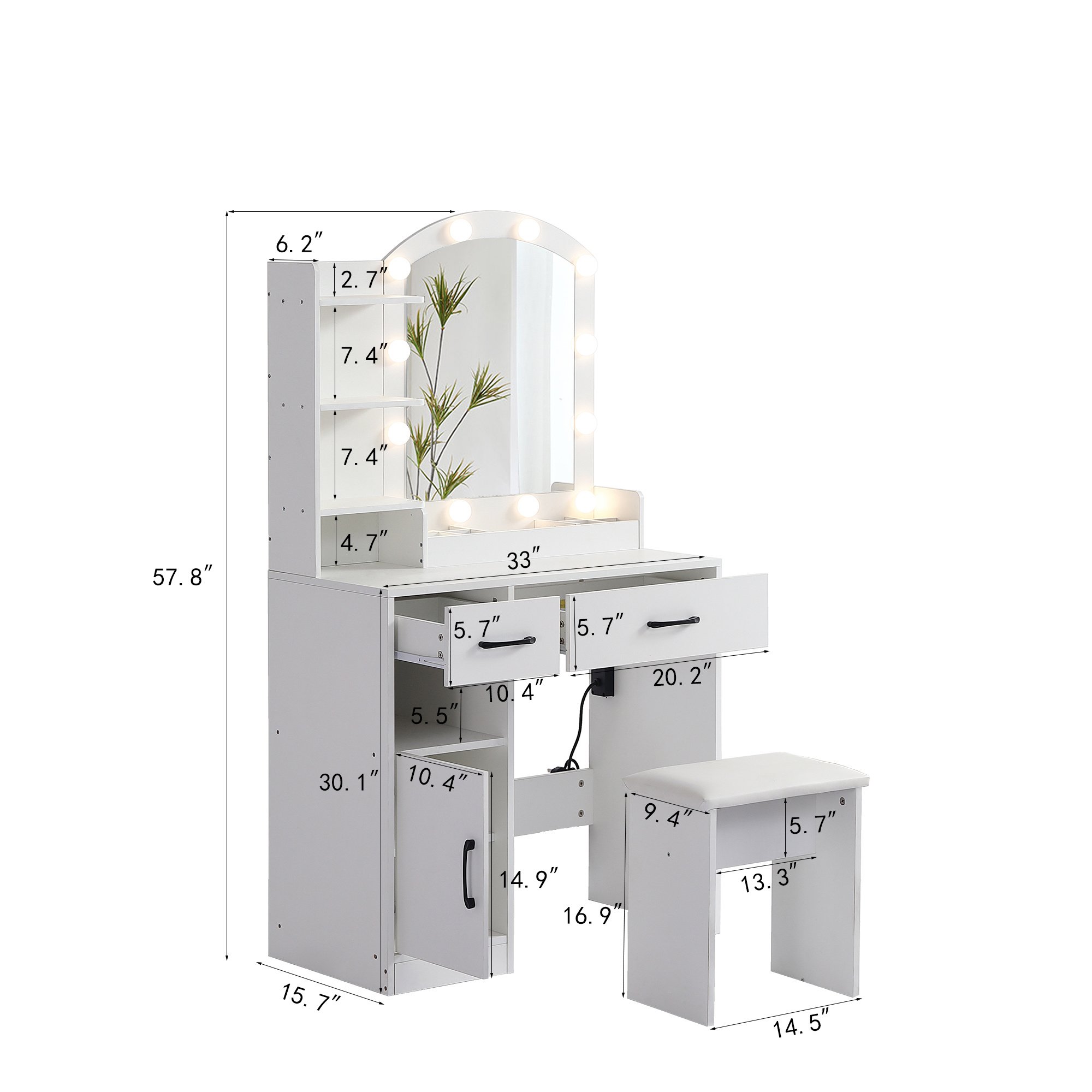 Super Large Storage Capacity: With 2 Drawers/1 door /1shelf storage, our vanities have ample storage for your makeup and hair tools, hide your cosmetics, skin care products and delicate ornaments in plenty of drawers and shelving options. And this dressing table have upholstered stool.
