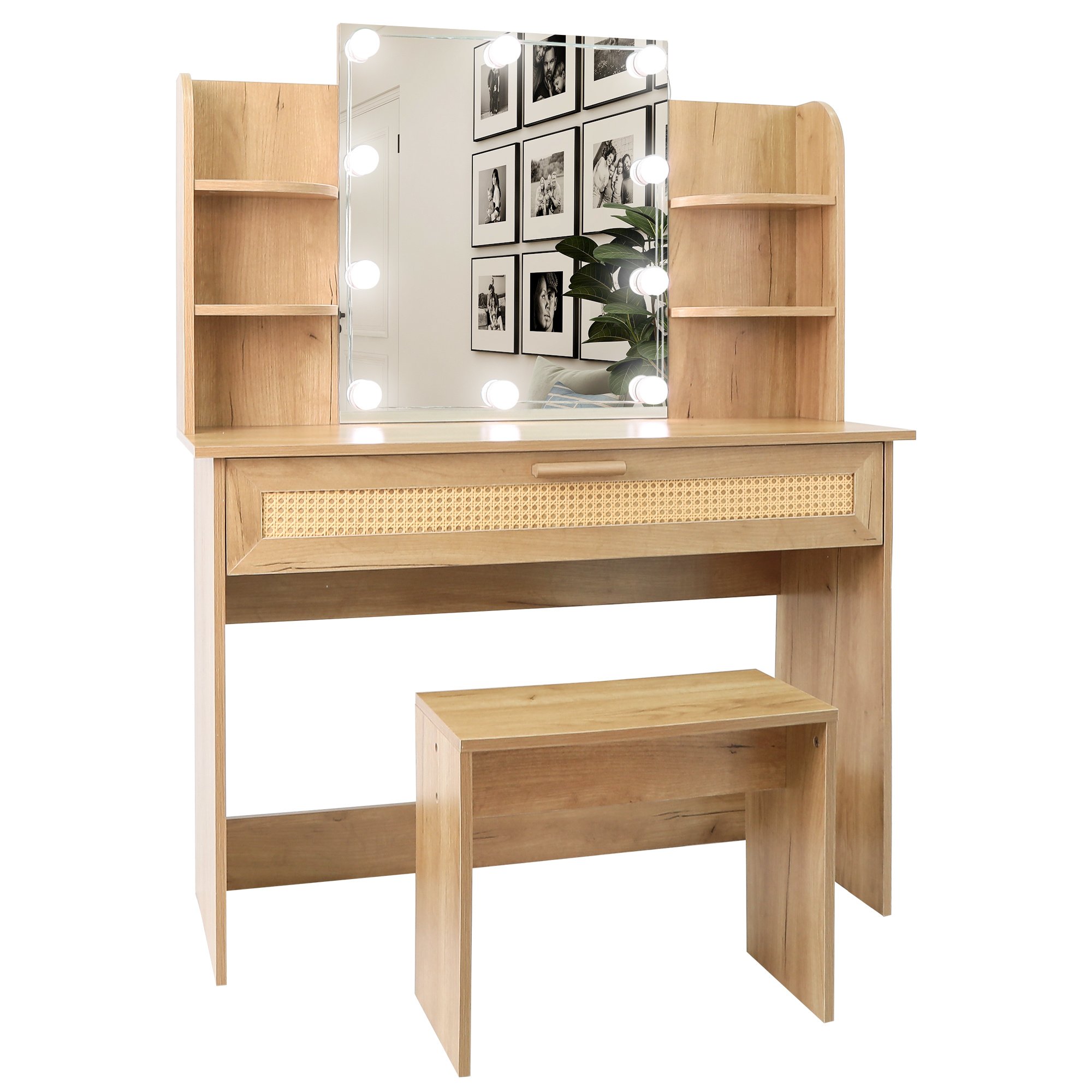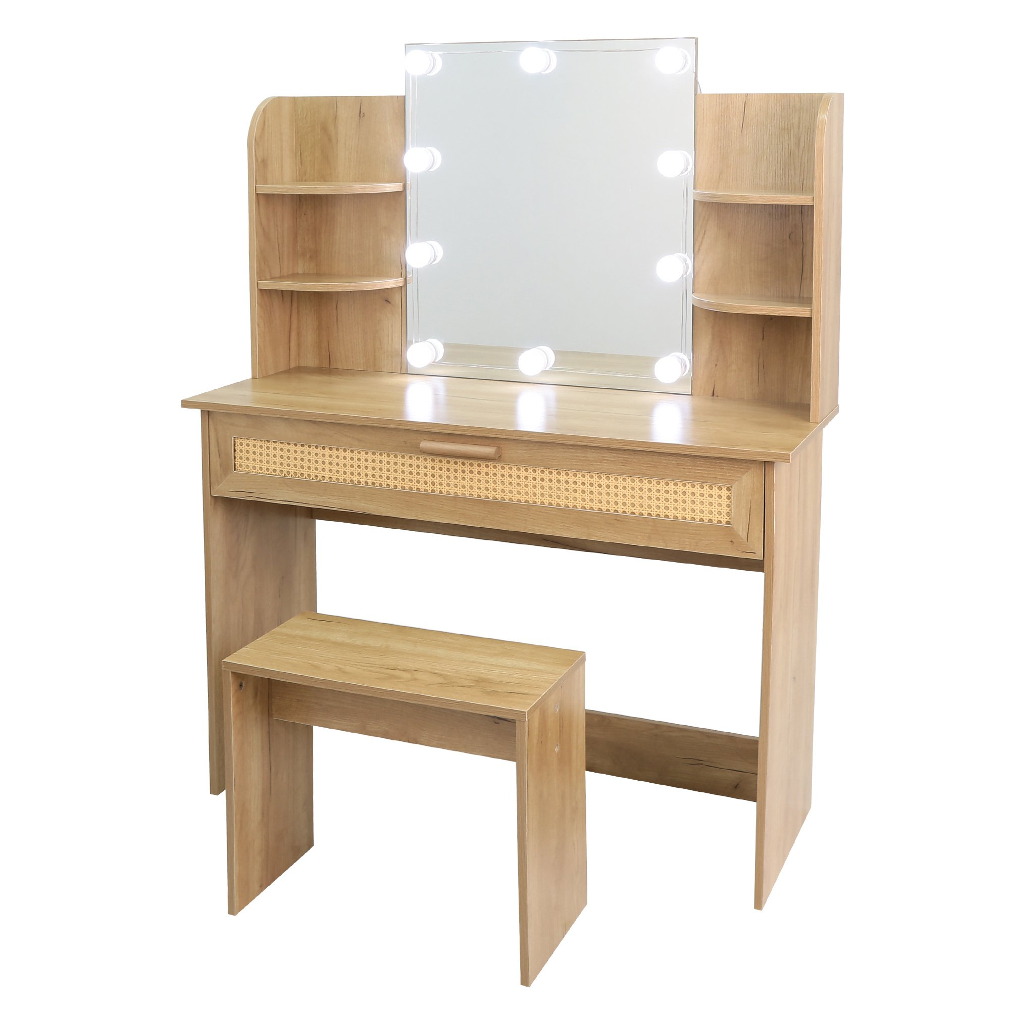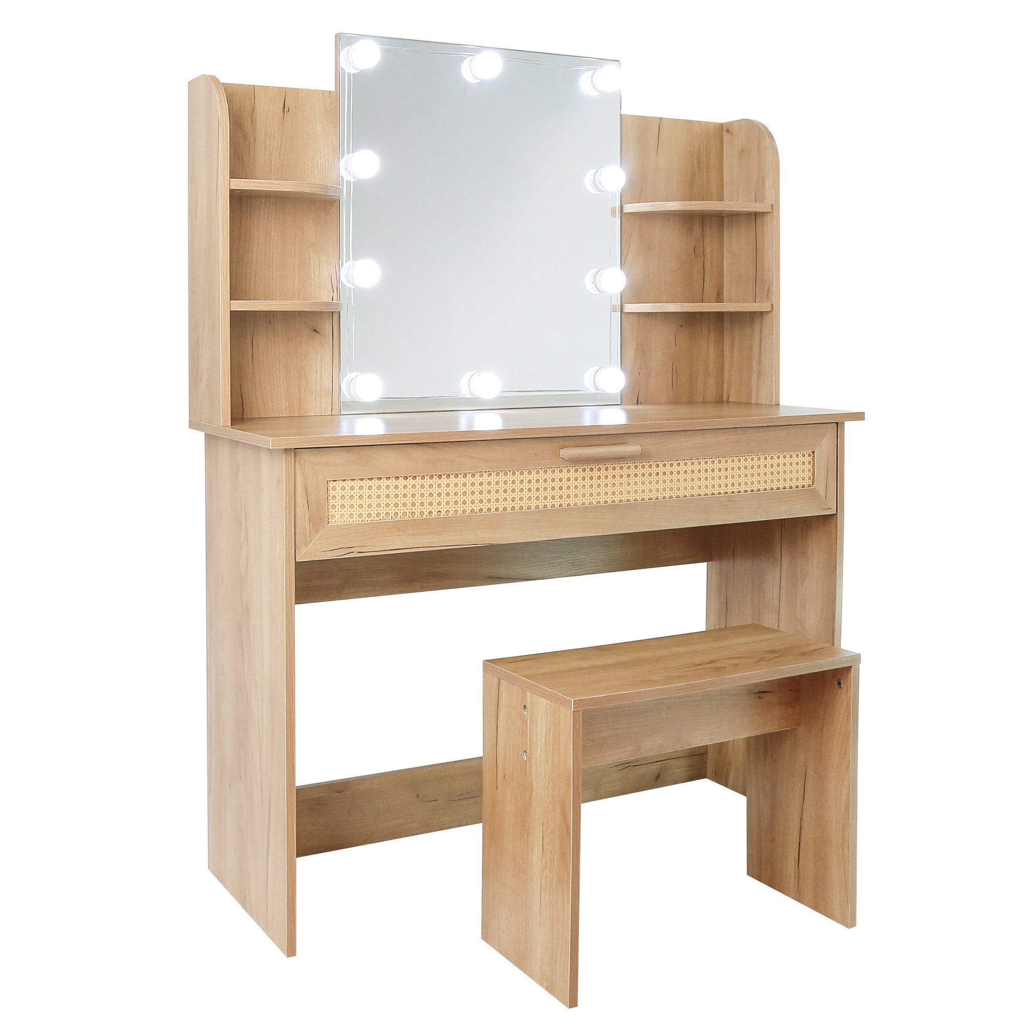 Vanity Desk Set Stool & Dressing Table with LED Lighting Mirror Drawer and Compartments Modern Wood Cosmetic Table Chest of Drawers Nature Color