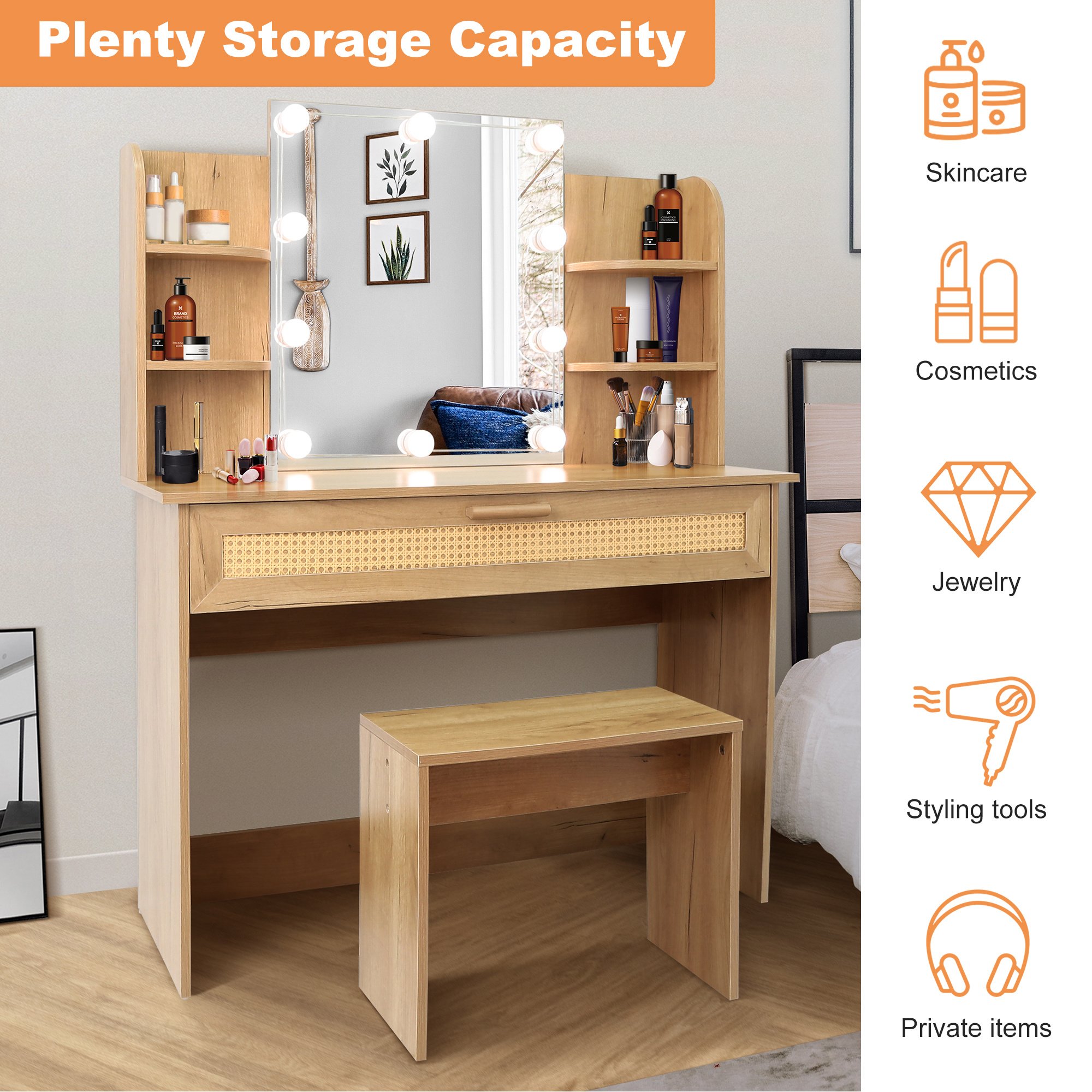[LARGE STORAGE CAPACITY] This vanity desk set is equipped with a super large drawer and open shelves on both sides of the mirror, which provide you with ample space. In this way, you can simply keep things in good order and store cosmetics according to different categories.